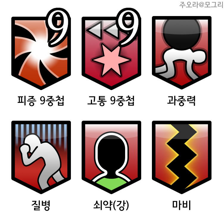 피증9, 고통9, 과중력, 질병, 쇠약 강, 마비. 스티커로 만들어서 부대원들께 나눠드리려고 만들었습니다. (힐러 뒷목잡는 소리가 들린다, 아니 근데 이게 9중첩까지 가능해?)
