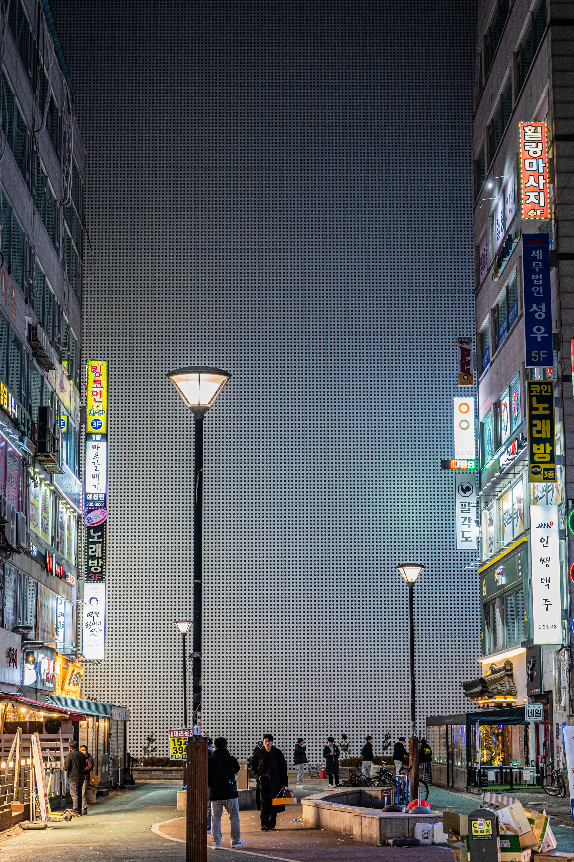 삼산동 먹자골목의 풍경은 크게 바뀌어 있었다. 새로운 가게도 많이 생겼으나 그것보단 삼산체육관이 보여야 할 곳에 우뚝 솟은 거대한 벽이 눈에 띄었다. 공사 중인 주차 타워인 모양인데 높이가 너무 높아 거대한 벽 안에 갇힌 것처럼 느껴졌다.
