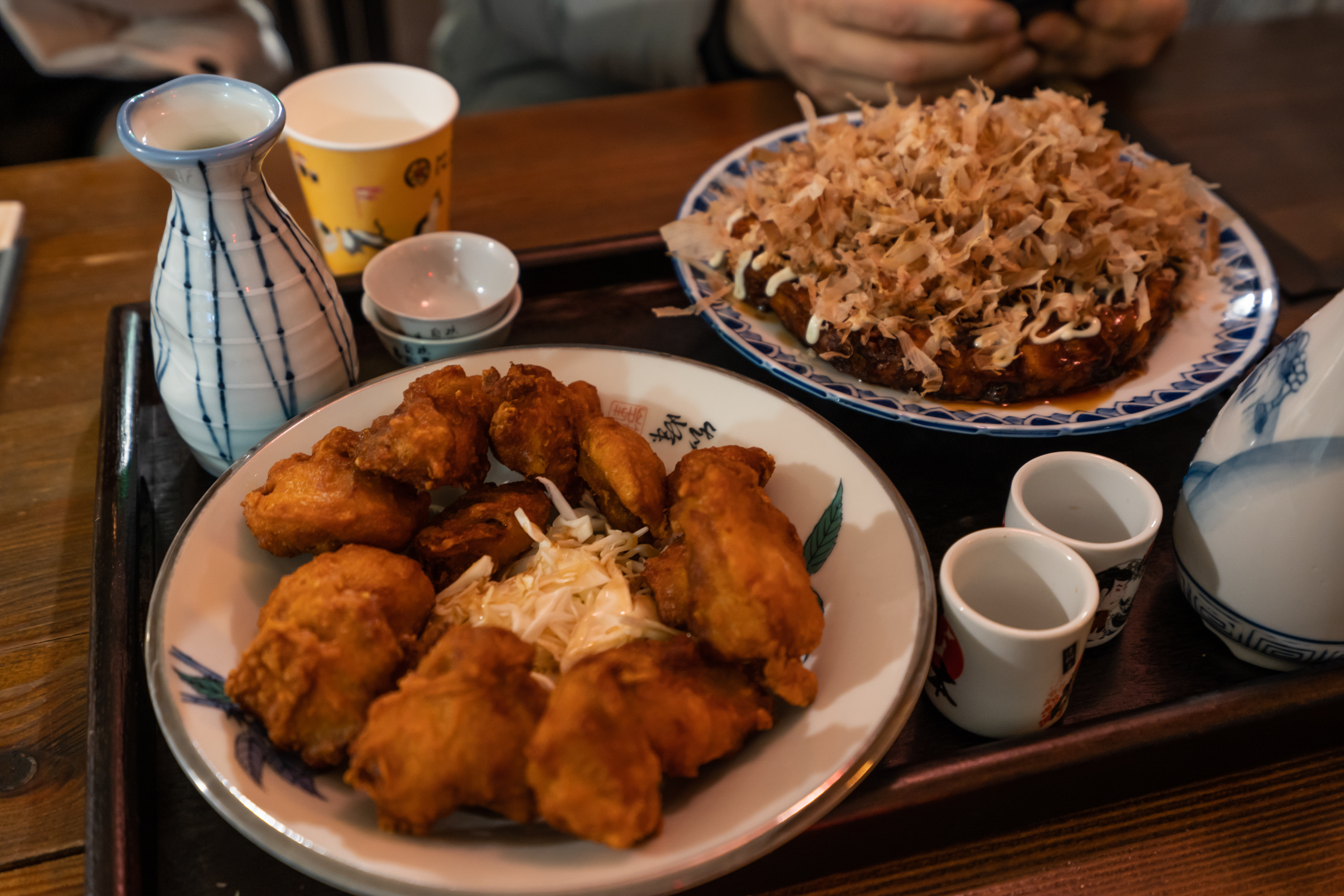 좀더 시간을 보내다 내부 이자카야에 가서 가라아게와 오꼬노미야끼를 시켜 놓고 도쿠리 세 잔과 하이볼 한 잔을 비웠다. 우리가 들어올 때부터 나갈 때까지 손님이 하나도 없었다. 안주는 모노마트 같은 곳에서 주문해 조리만 하는 것일 테지만 아무튼 먹을만했다. 타코와사비가 서비스로 나왔다. 옆에는 뜬금없게도 성인용품 매장이 있었다.