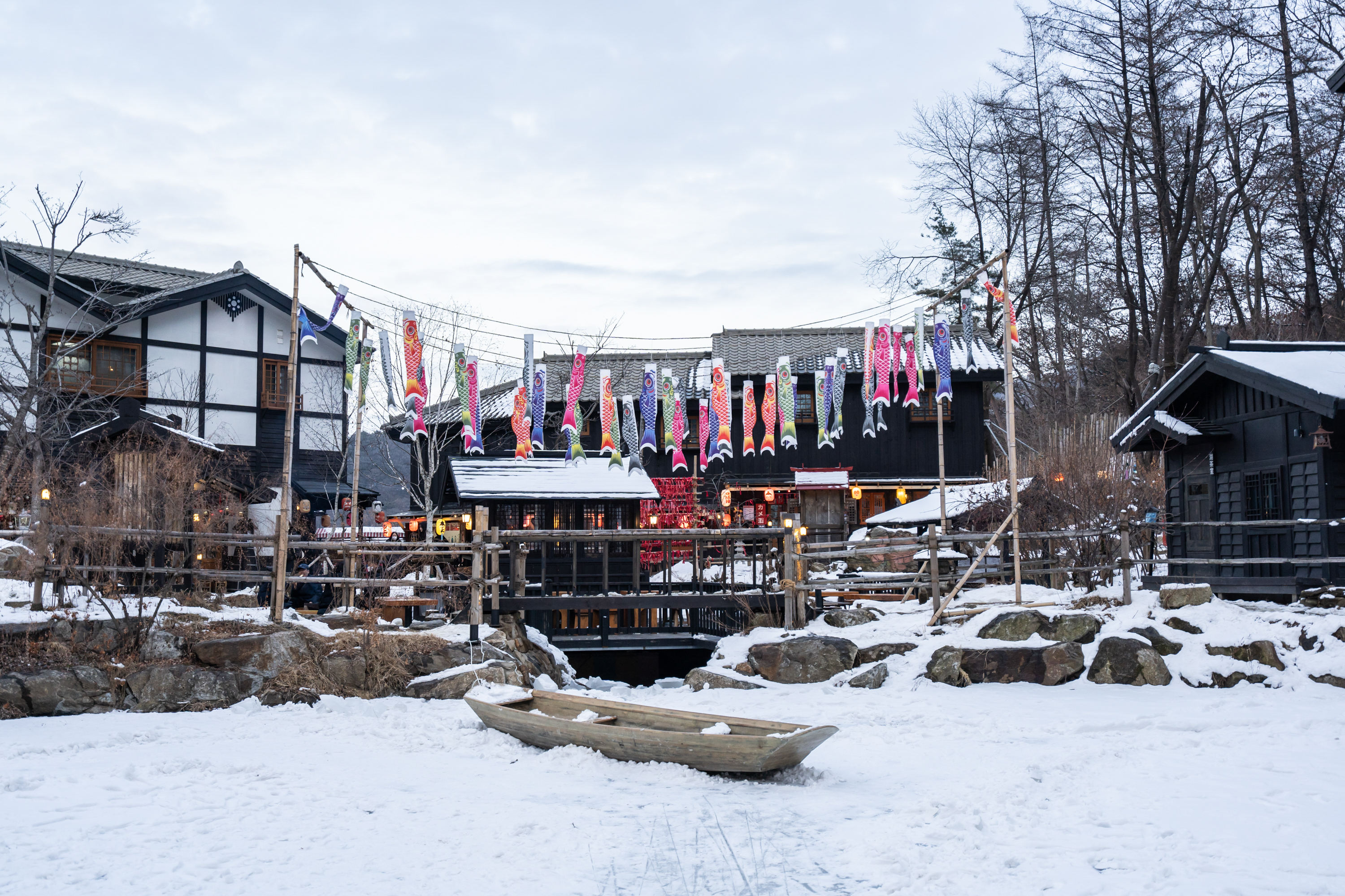 다시 밖으로 나가 여기저기 돌아다니고 사진도 찍으며 즐거운 한 때를 보냈다. 중앙의 연못이 얼어 얼음썰매를 탈 수 있었다. 쌓인 눈 때문에 앞뒤로 어느 정도 왕복해 움직일 뿐이었지만. 료칸 패키지에 포함된 1인 무료 기모노 대여권은 동생이 사용했는데 춥고 움직이기 불편하다 보니 한 바퀴 돌고 식사 전에 바로 반납했다. 착장 시간 15분을 제외하면 총 30분 정도 빌린 듯하다. 어느덧 어두워지고 료칸 미이용 고객이 떠나자 사람이 확 줄었다. 저녁은 내부 식당에서 먹었는데 일본풍이라는 느낌은 났지만 아쉽게도 가격에 비해 퀄리티는 썩 좋지 않았다.