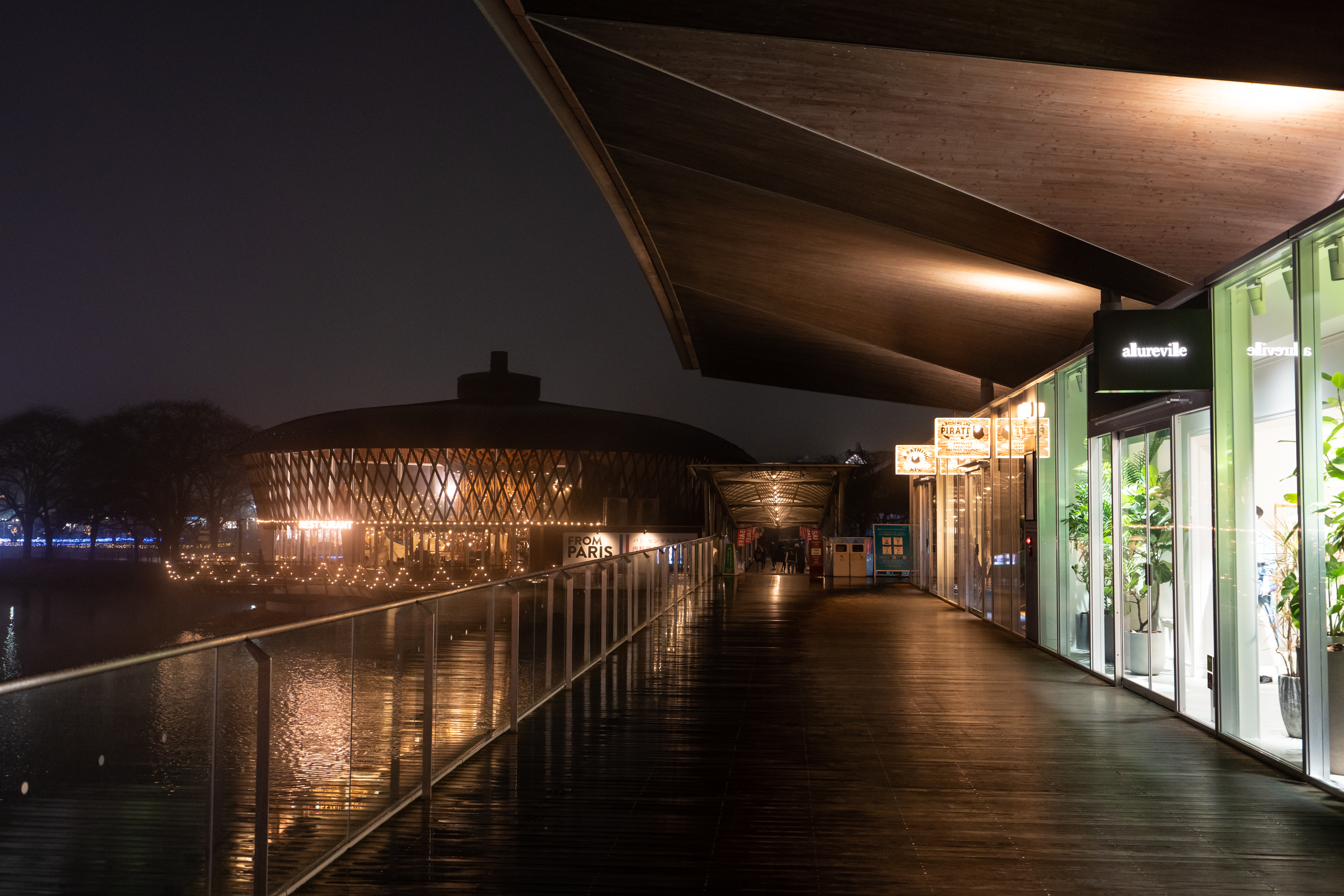 짐을 풀고 나니 일정표대로 이미 저녁이라 관광지는 갈 수 없었고, 아울렛이 아직 열려 있었지만 영업 종료가 임박한 시간이었다. 폐점 30분 전에 도착해 미리 찍어놓은 가게를 구경했다. 동생 생일선물로 잠바를 하나 사 줬고, 나도 마음에 드는 귀여운 옷을 찾았지만 XL 사이즈밖에 없어 사진 못했다. 가운데의 호수, 자욱이 깔린 안개에 산란되는 조명이 예뻤지만 별로 살 것은 없었다.