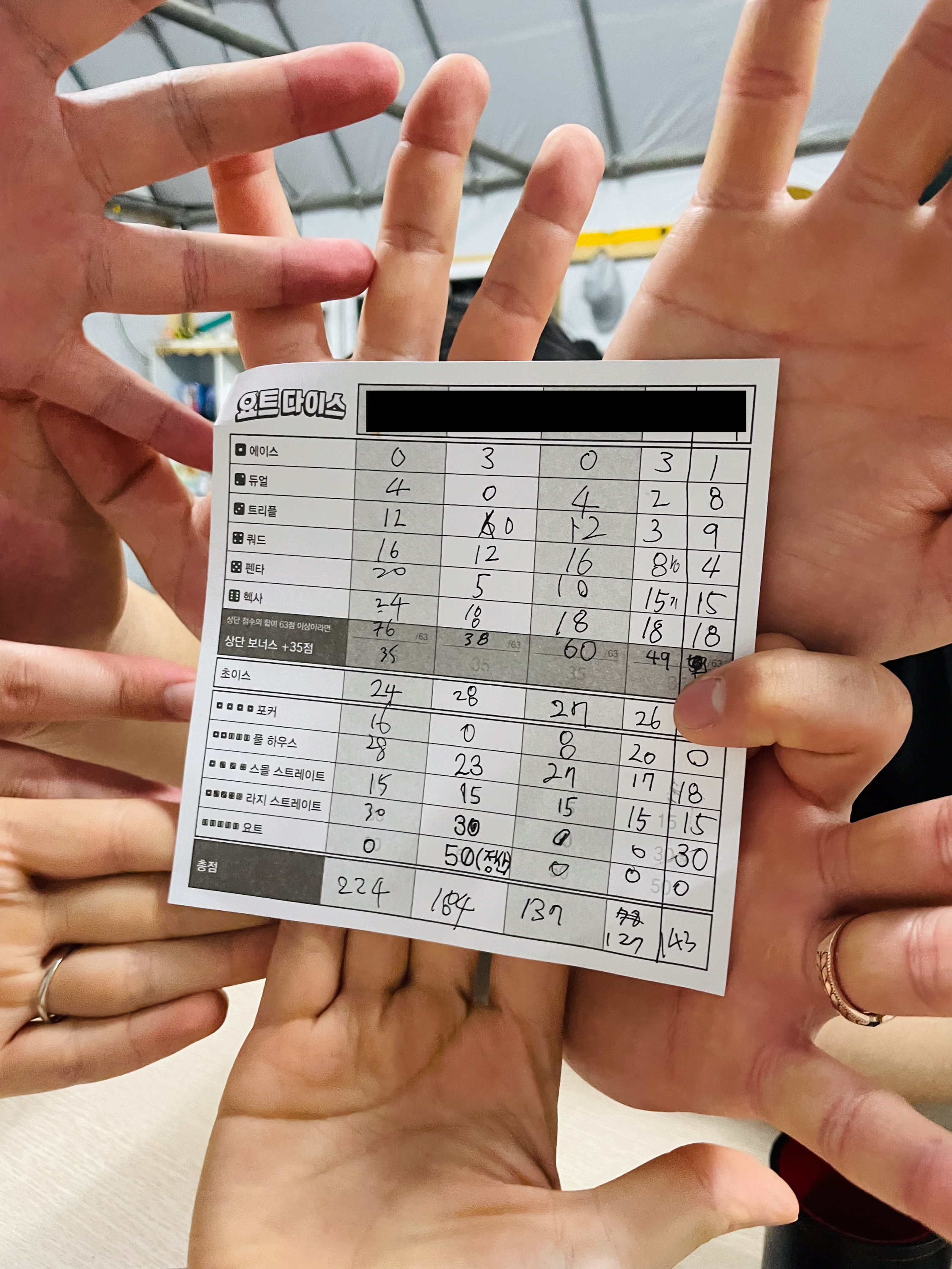 어두워지기 전에 정리를 마치고 농막으로 들어갔다. 과자를 펼쳐 놓고 내가 서울에서 바리바리 싸들고 내려온 보드게임을 했다. 요트다이스는 믿을 수 없을 정도의 주사위 운으로 요트를 제외한 모든 칸을 채워 224점을 낸 내가 1등을 했다. J는 “이번에 요트 나오면 오늘 먹은 것 낸다”라고 말한 직후 요트를 띄워 상처뿐인 2위를 얻어냈다. 점수판을 찍을 때 “유튜브 손”에 대해 설명해줬는데, 모두가 손을 내밀어 유튜브 손은 커녕 마치 천수관음이 들고 있는 것처럼 찍혔다.