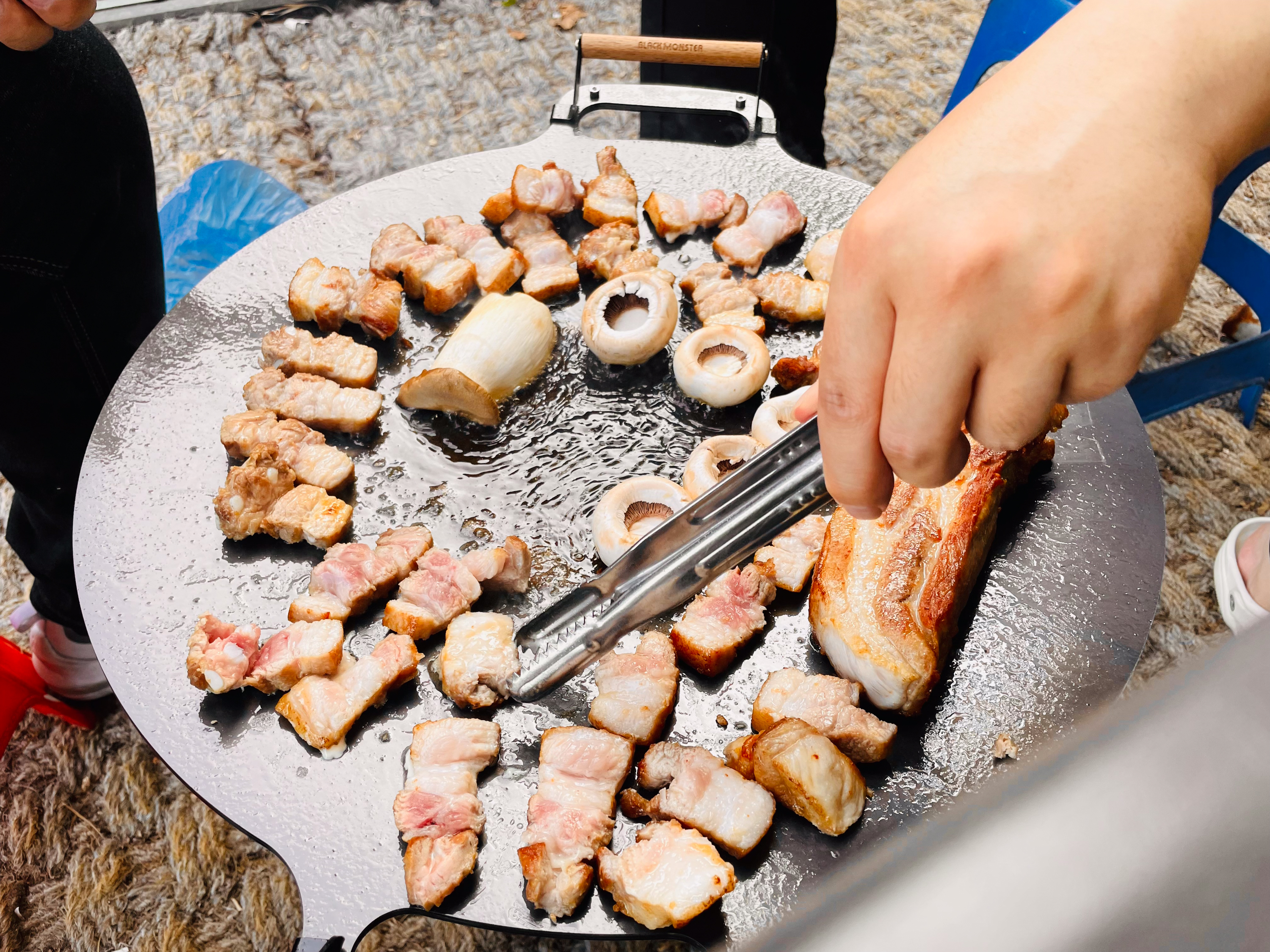 T는 전날 야간 근무가 있어서 수면을 취한 후 조금 늦게 도착했다. S는 이번에 구입했다는 가스통과 커다란 그리들을 설치 후 고기를 굽기 시작했다. 숯불 직화에 비하면 아주 맛있는 건 아니었지만 밖에서 먹으니 분위기가 좋았다. 여전히 밭에 계신 아버지께도 쌈을 싸다 가져다 드리면서 버섯, 소시지, 양파 등을 추가로 구웠다. 두 번째 메뉴로는 닭갈비와 볶음밥을 해 먹었다. 급히 밭에서 깻잎을 따 와 넣었는데 향이 강해 좋았다.