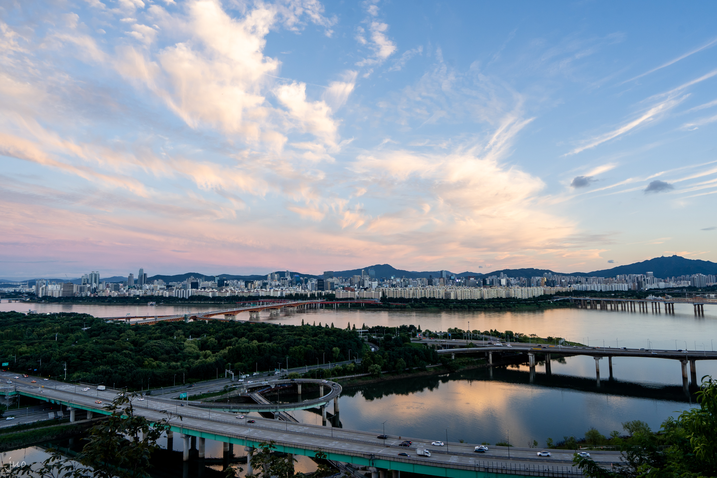 해가 지고 “별 길을 따라 다시 다리를 건너”는(이건 이루펀트의 곡이다) 차들의 헤드라이트와 다리의 조명이 빛나기 시작했다. 삼각대를 꺼내 세우고 사진을 몇 장 찍다가 달려드는 모기에 질려 후퇴했다.