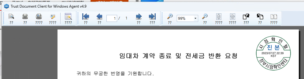 이제 내용을 확인할 수 있게 되었지만 메뉴가 다 깨진다. 역시 악성 프로그램은 하나만 하지 않는다. 두 번째 버튼이 인쇄로 보이지만 누르면 beep음과 함께 허무하게 종료된다.