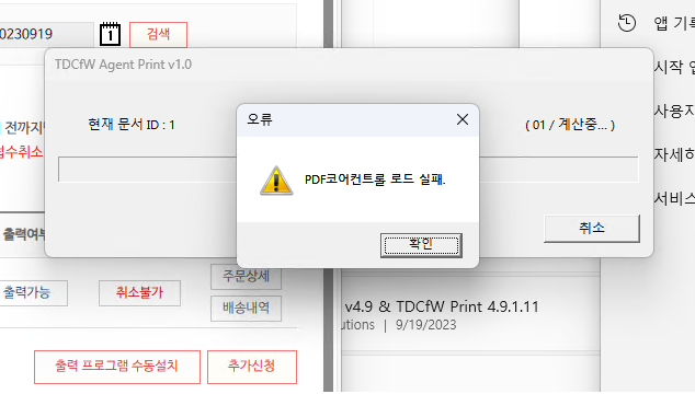 왼쪽의 접수번호를 누르자 일괄출력이 가능한 메뉴가 있다. 하지만 일괄출력에서는 아래와 같은 오류가 발생한다.