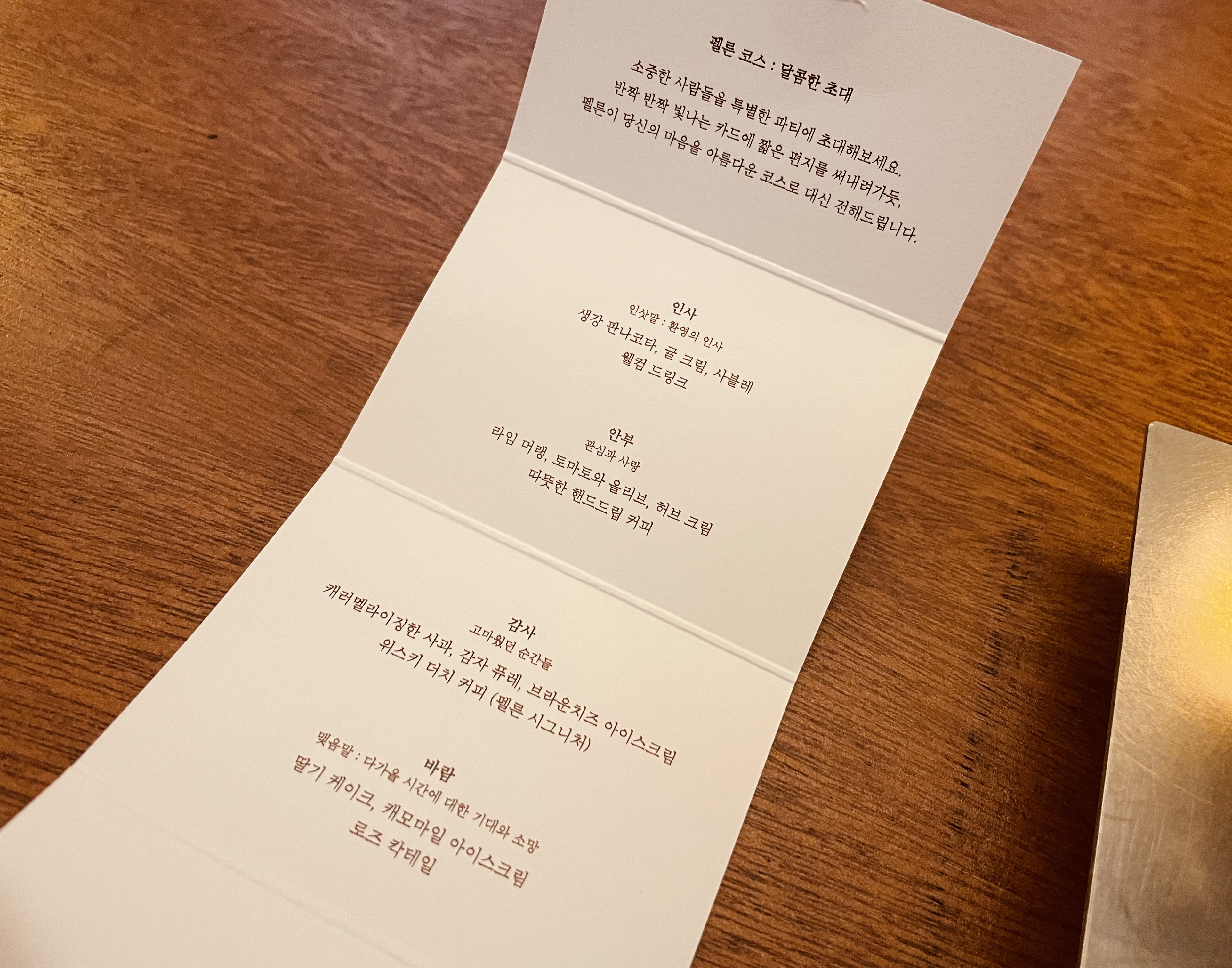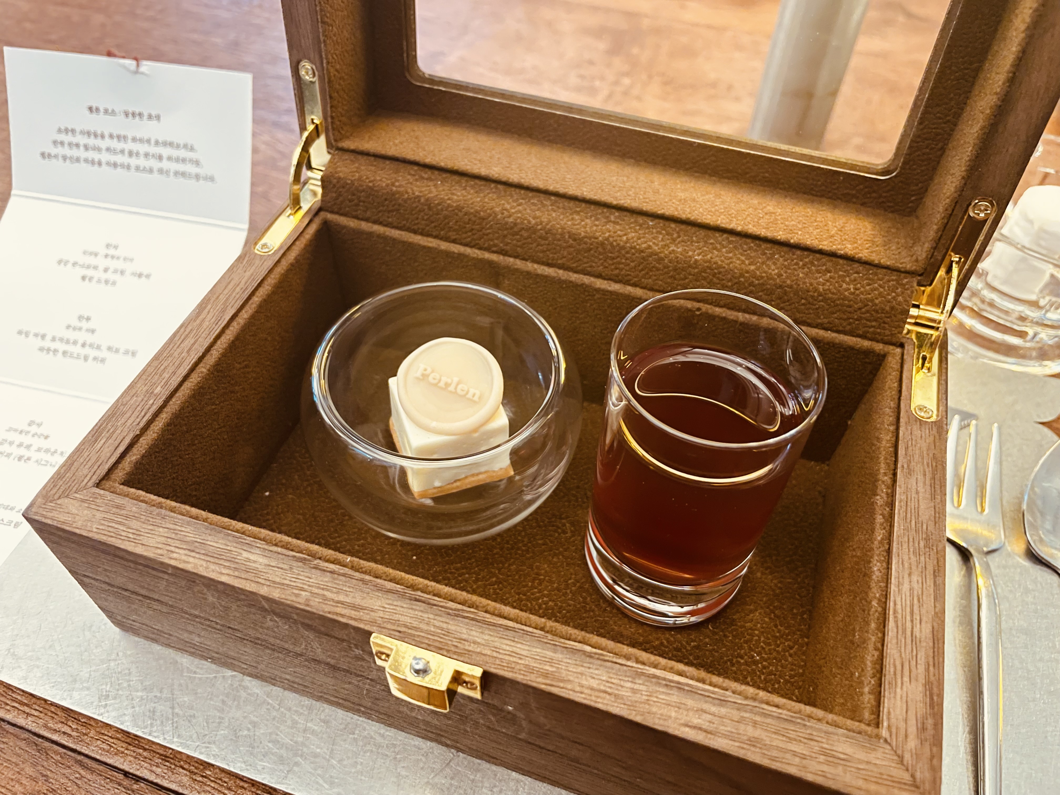 비가 부슬부슬 오다말다 하는 흐린 날이었고 좀 더 분위기 있게 코스를 즐기게 되었다. 총 네 개의 페어가 제공되었고 커피는 두, 세 번째에 페어링 되었다. 각 음식마다 스토리를 준비해 주셔서 나도 의미부여를 하려 노력해 봤다.