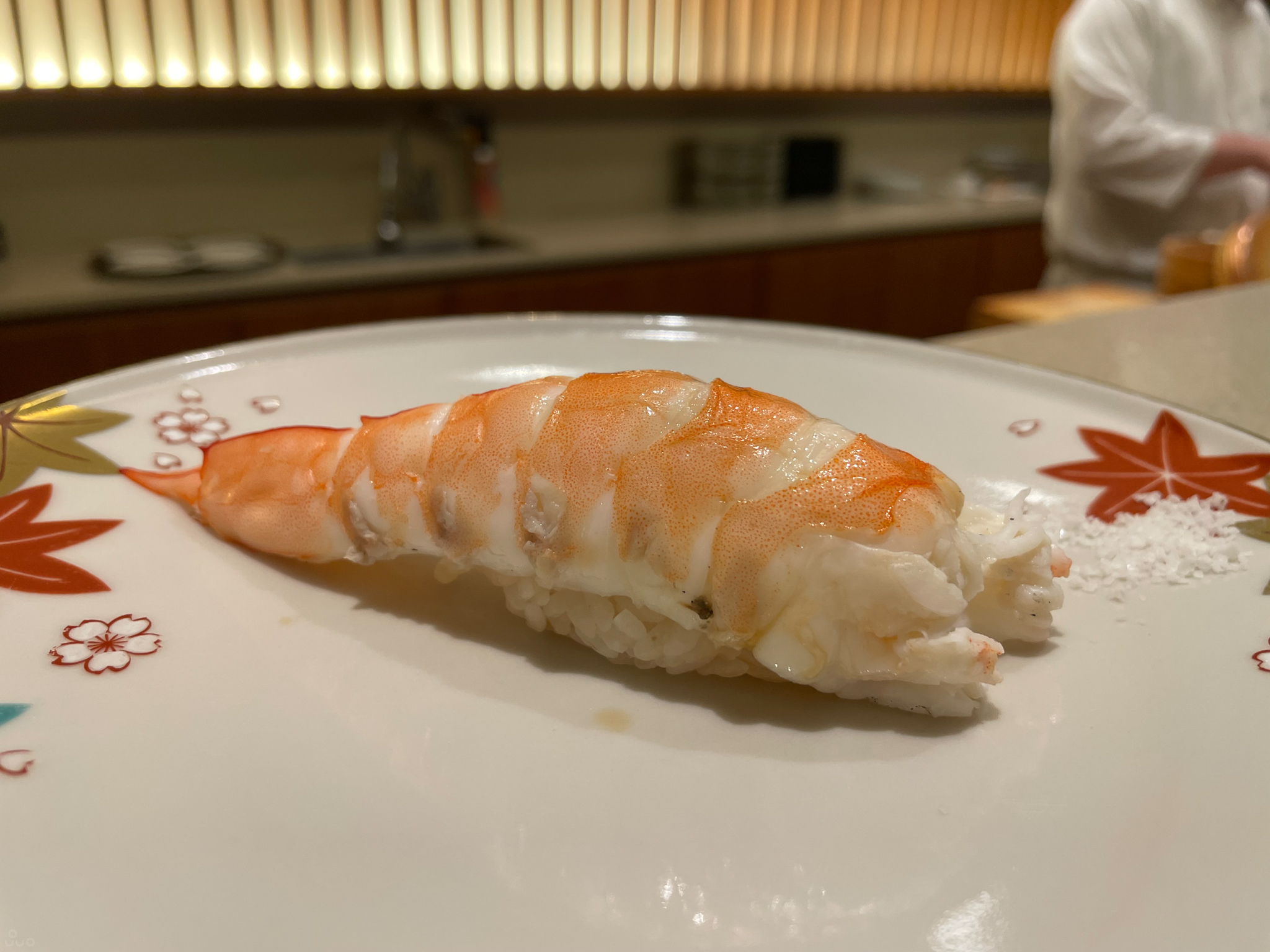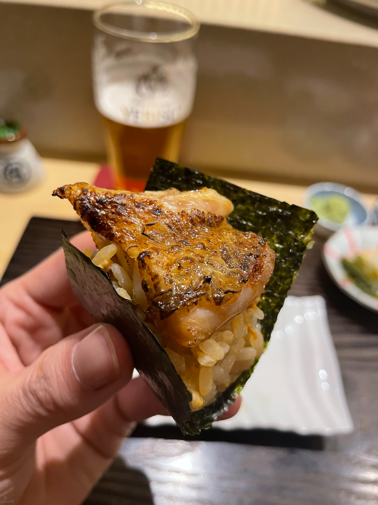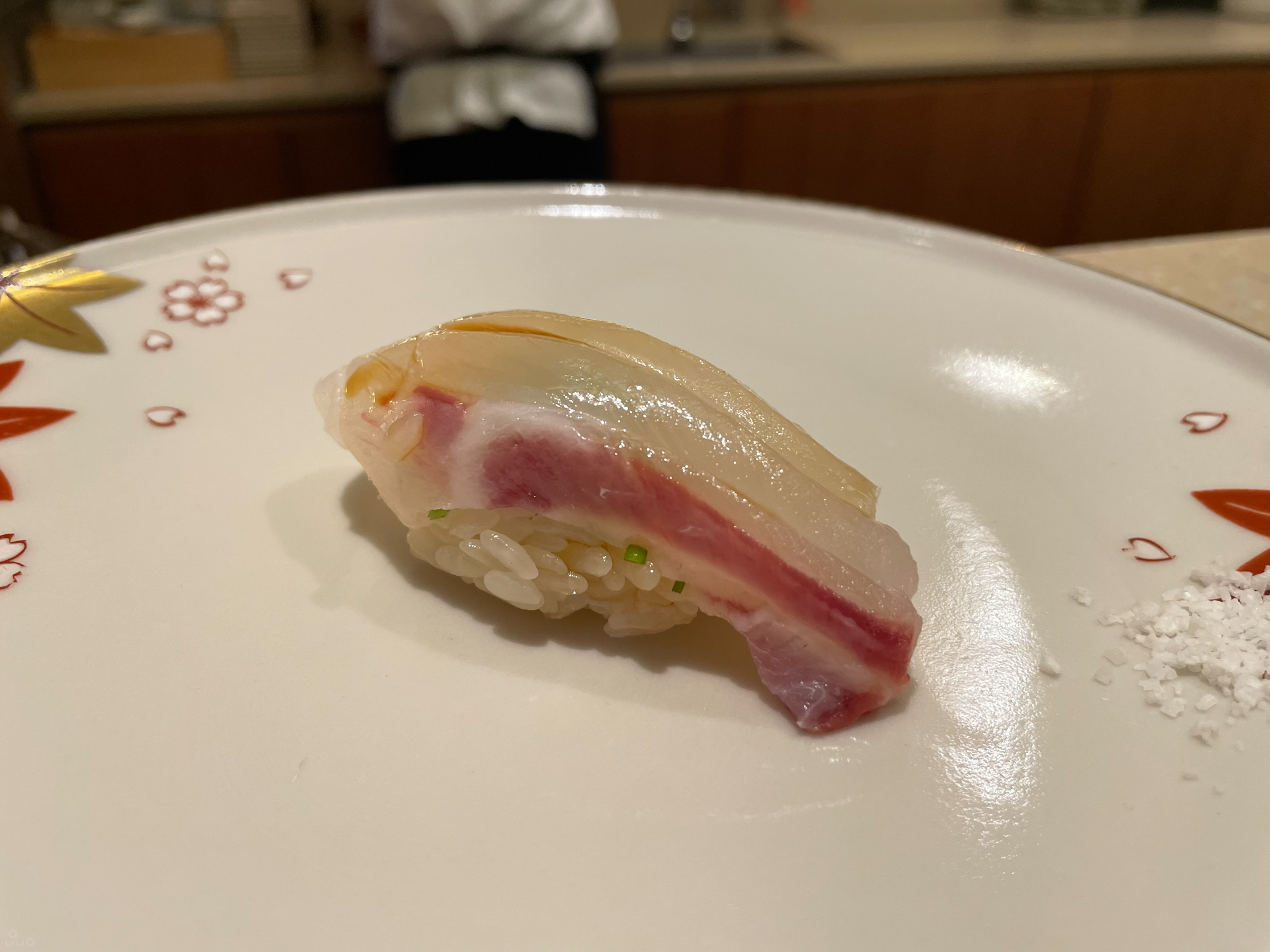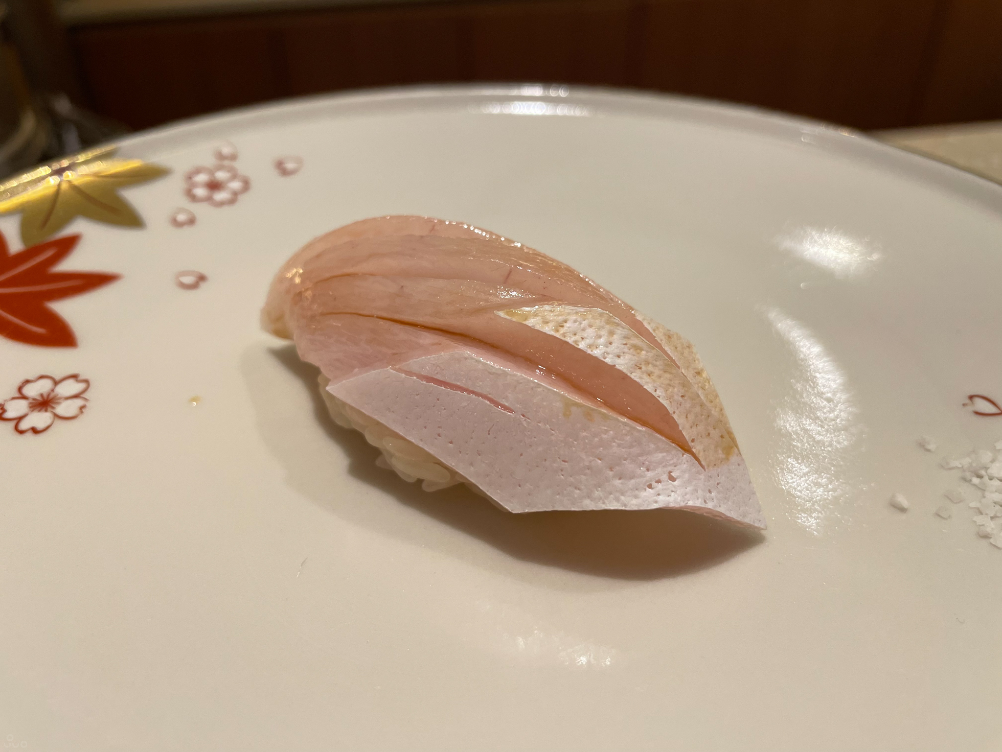 도미 초밥부터 시작. 샤리는 꼬들하며 요새(라기엔 이것도 좀 됐지만) 트렌드대로 건조한 짠맛과 신 맛이 난다. 두껍게 썰린 고소한 도미와 잘 맞고 포만감이 있다. 밥 양은 조절할 수 있다. 혹시 균형이 깨질까 싶어 그대로 먹었는데, 먹고 나니 양이 꽤 많아서 줄이는 편이 나았을지도.