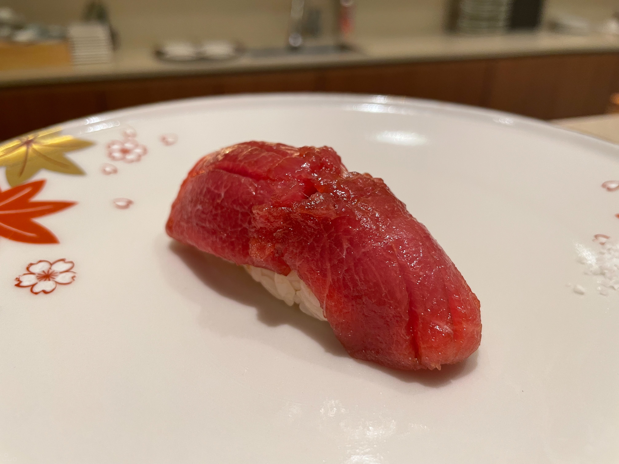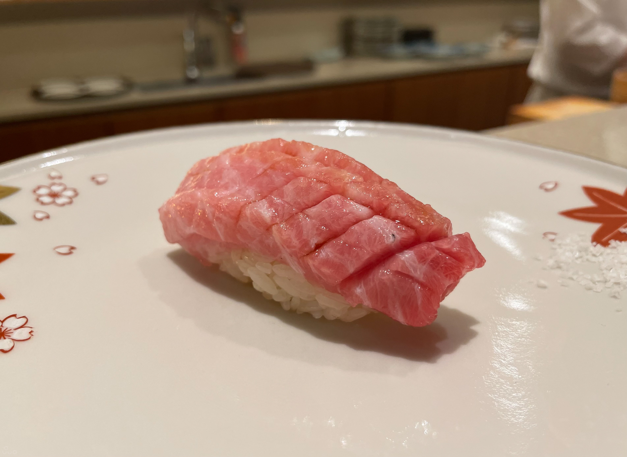 대뱃살. 힘줄 부분이 조금 남아있는 느낌이었다. 먹을 때마다 느끼지만 엄청난 감칠맛과 고소한 기름이 느껴진다. 항상 마지막 즈음에 나오는 이유가 있다.