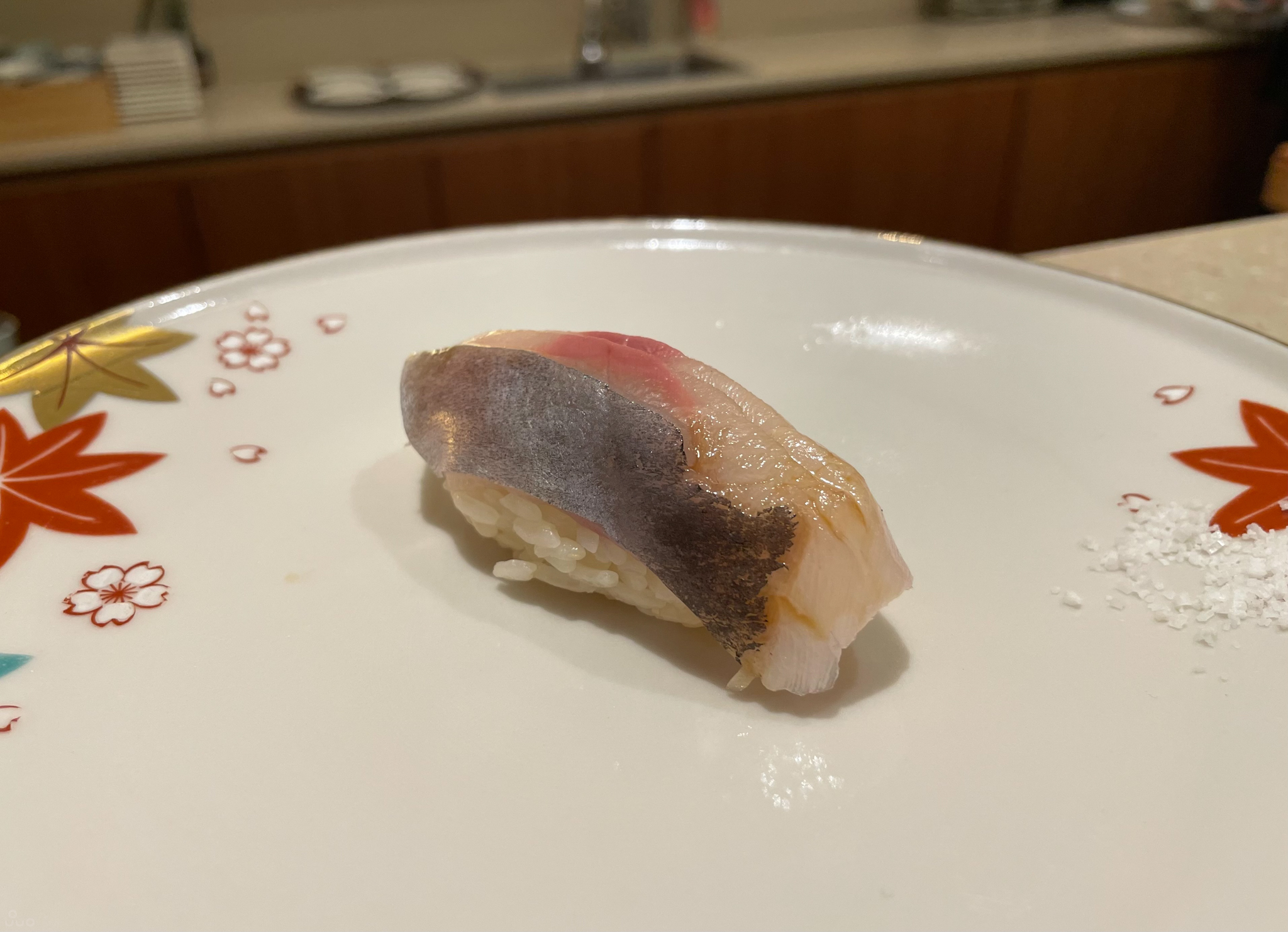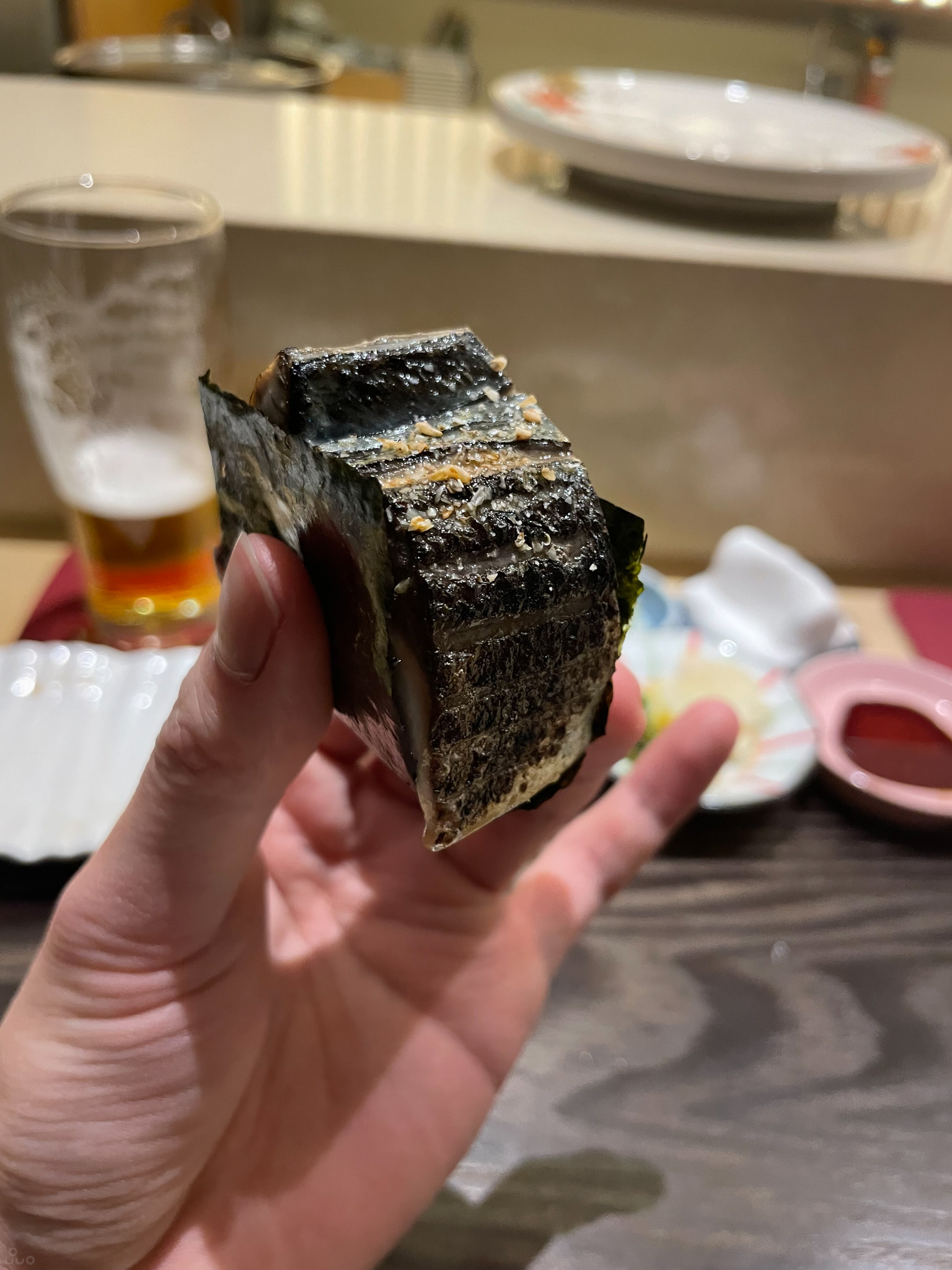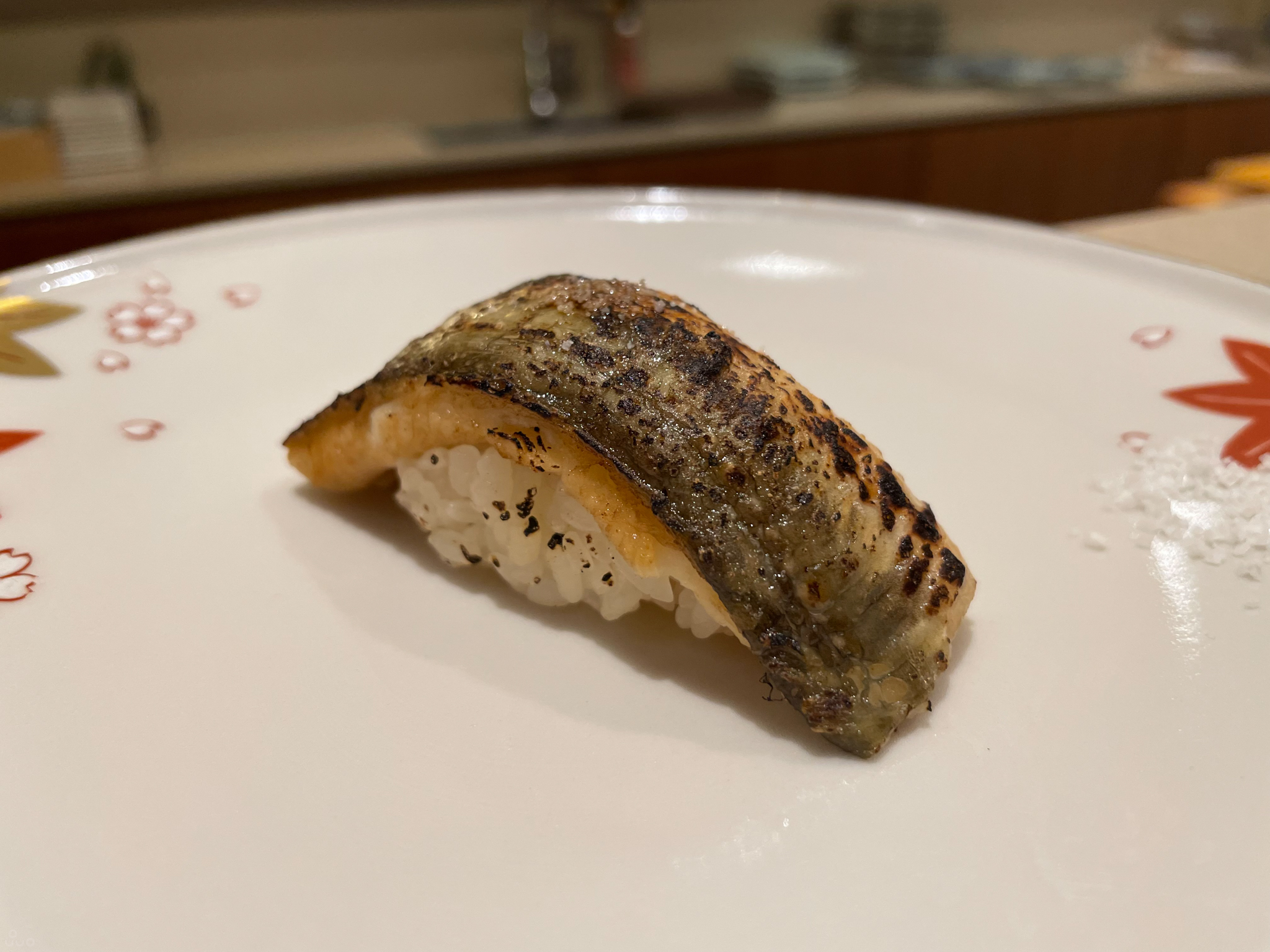 학꽁치. 예쁘게 돌돌 말린 모양으로 얹혀 나온다. 전에도 느꼈지만 이런 류의 생선은 짜고 간이 강한 샤리와는 좀 어울리지 않는 느낌이다. 아니면 샤리 양을 좀 줄이는 게 나았을지도 모르겠다.