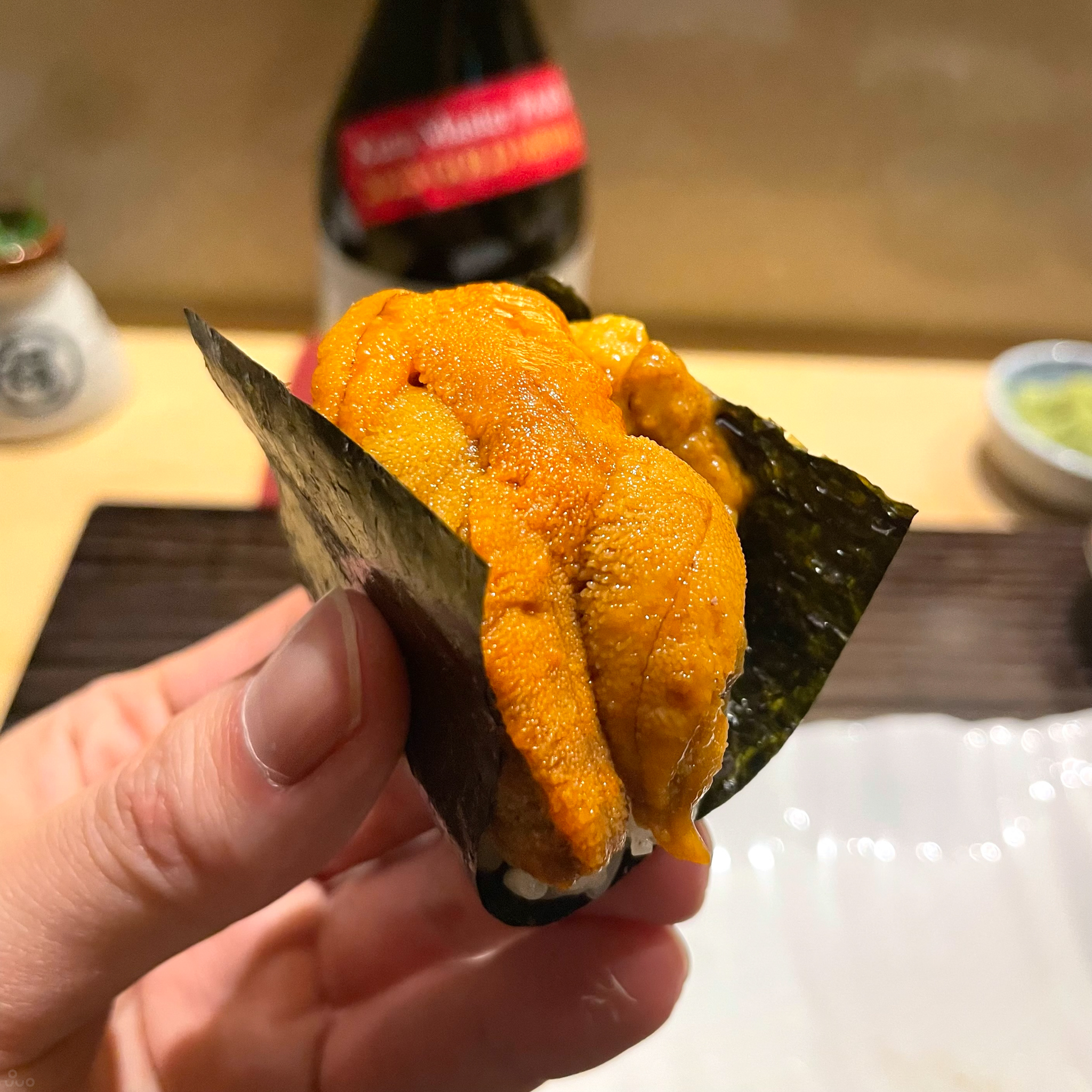 북해도산 성게. 푸짐하게 올라가 있다. 일본산 성게를 한국에서 먹었을 땐 아무래도 신선도가 약간 떨어져선지 비린 맛이 살짝 올라오는 경우가 있는데, 그런 느낌은 없었다.
