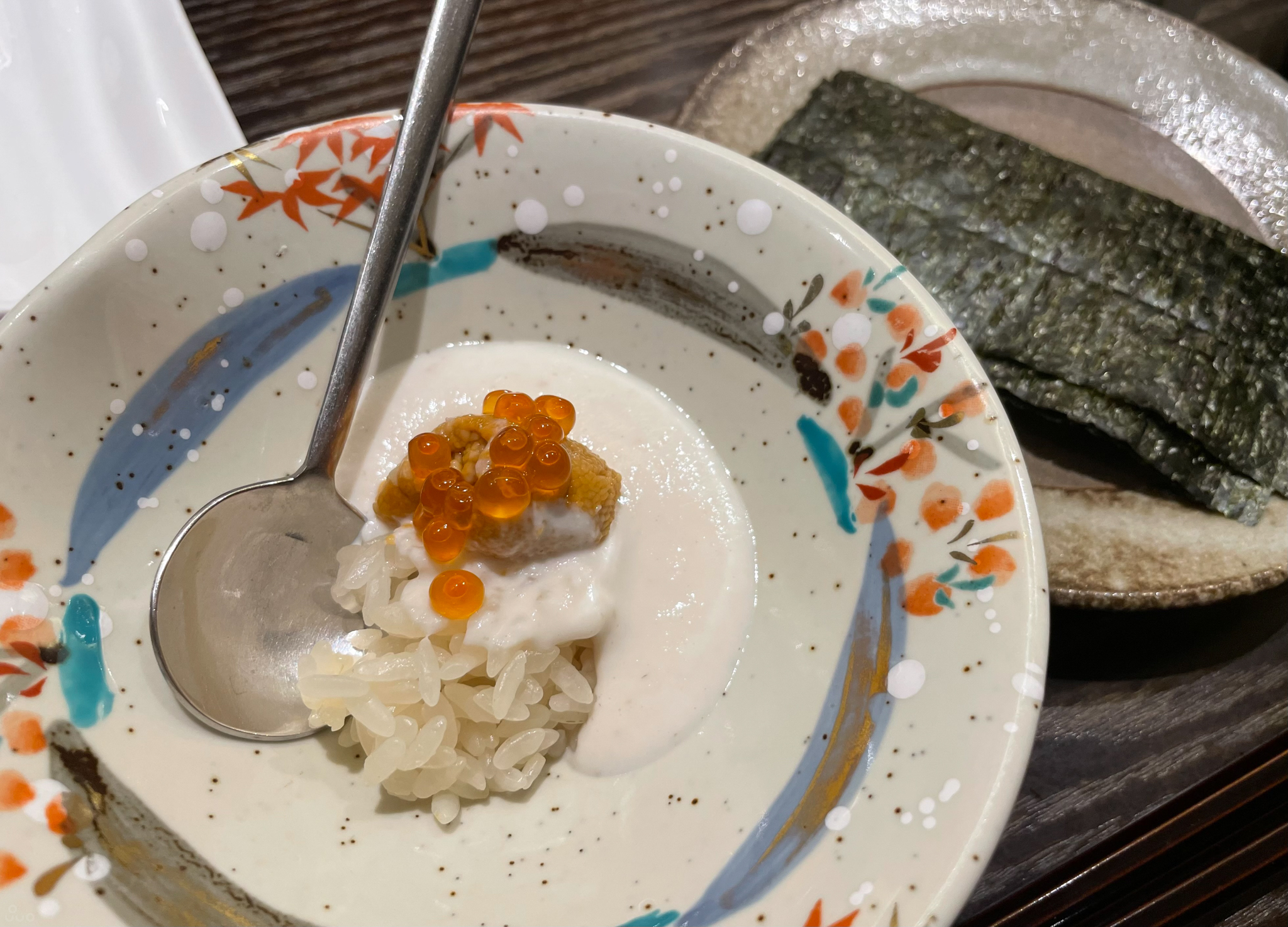 연어알, 성게알, 복 정소구이, 밥. 정소구이는 먹기 편하게 갈아서 부드러운 크림소스처럼 나온다. 알 종합선물세트로 고소함과 감칠맛이 폭발한다. 같이 나온 김에 싸 먹으니 느끼함도 잡아 준다.