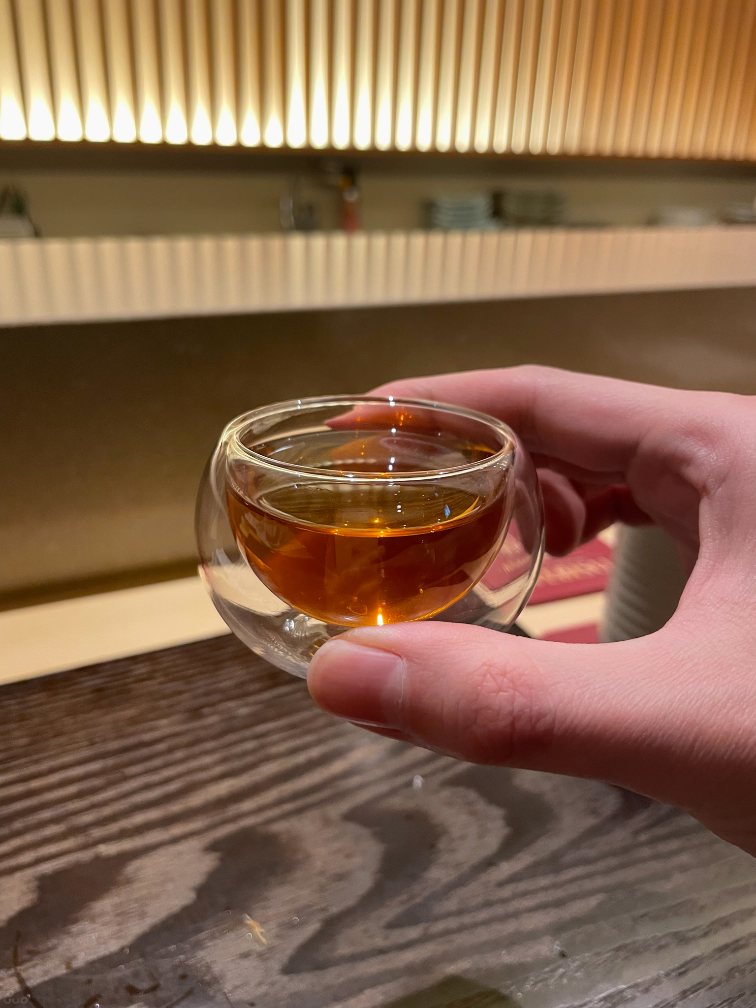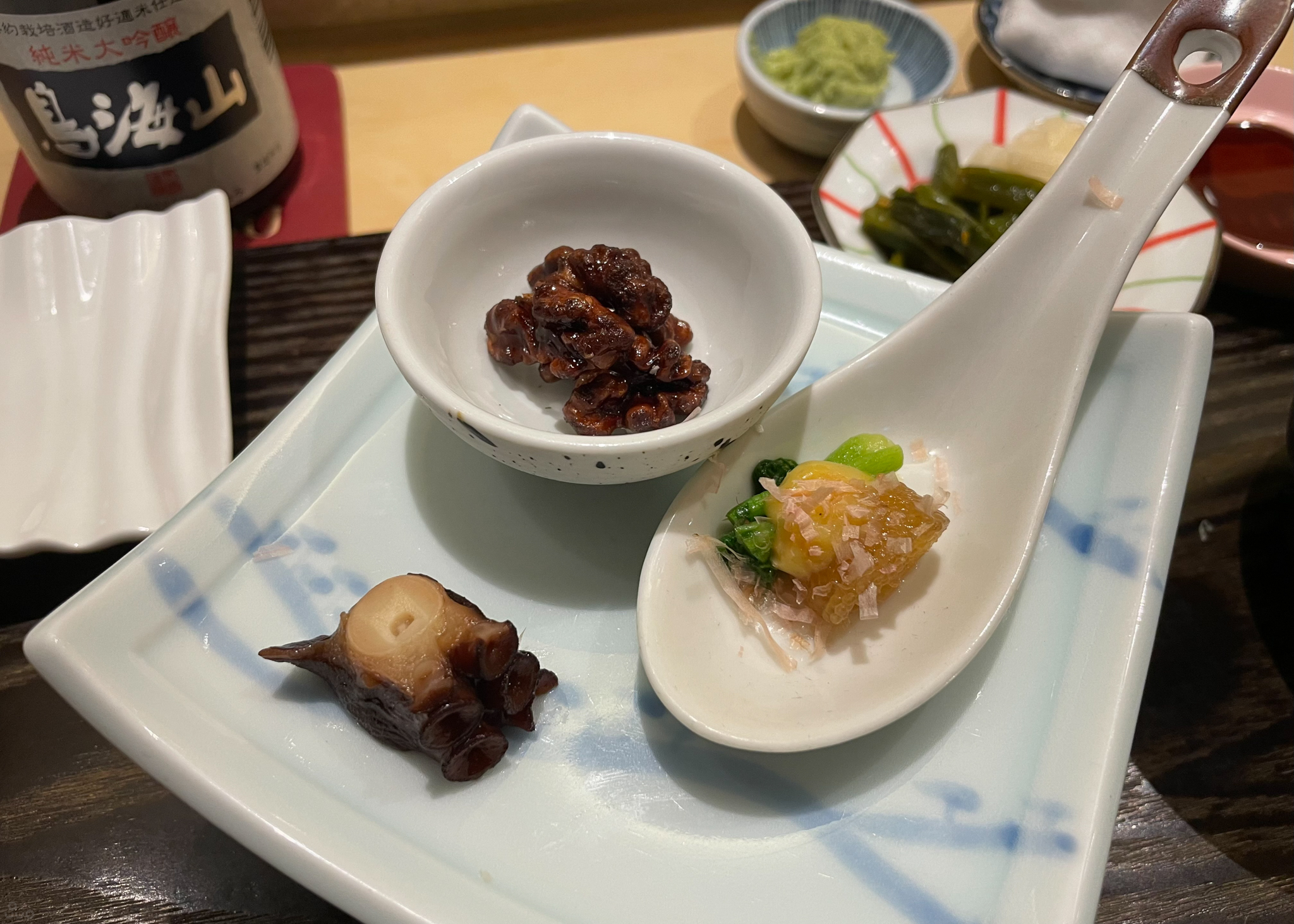 안주 3종. 문어는 부드럽게 흩어지면서 씹히는 질감, 일본식으로 달달하게 조미되어 있다. 두릅과 계란 소스, 청어알은 새콤하면서 소재 특유의 오도독거리며 씹히는 맛이 재밌다. 호두정과는 달고 고소하고 바삭했다.