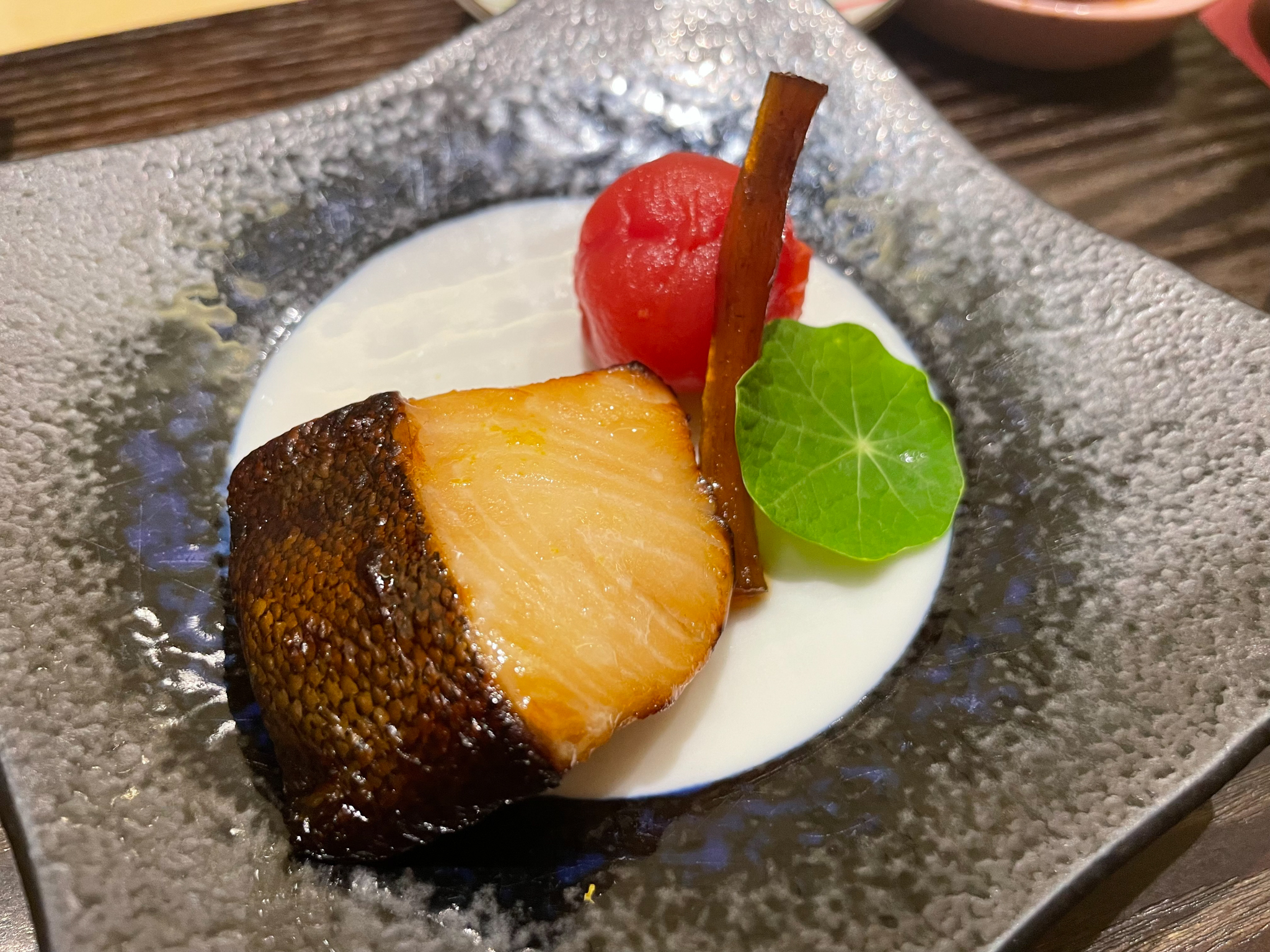 금태와 성게 크림. 금태는 불로 지져 부드럽고 따뜻했으며 성게 크림과도 잘 어울렸다.