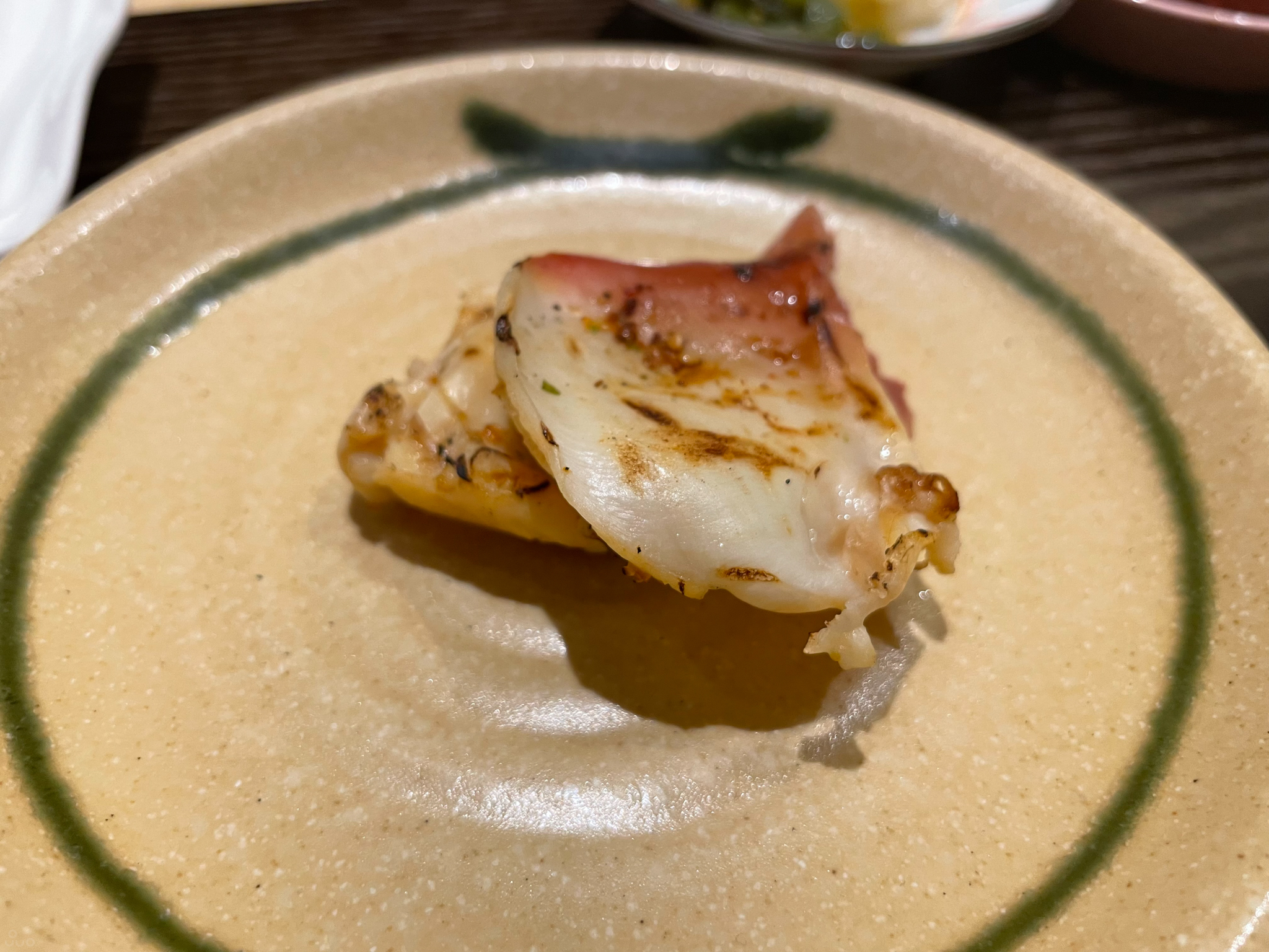 대합 간장양념 구이. 이거 구이로 먹어보는 건 처음이다. 간장 향이 날 정도로만 간이 되어 있다. 탄력 있게 질기면서 부드러운 조직감이 특이했다. 조개 특유의 단 맛도 조금 느껴진다. 그래도 역시 조개를 구울 거라면 껍질 채로 굽는(거의 삶는 거지 이거) 것이 육즙 보존에 유리한 듯, 조리법 특성상 촉촉함이 부족한 점이 좀 아쉬웠다.