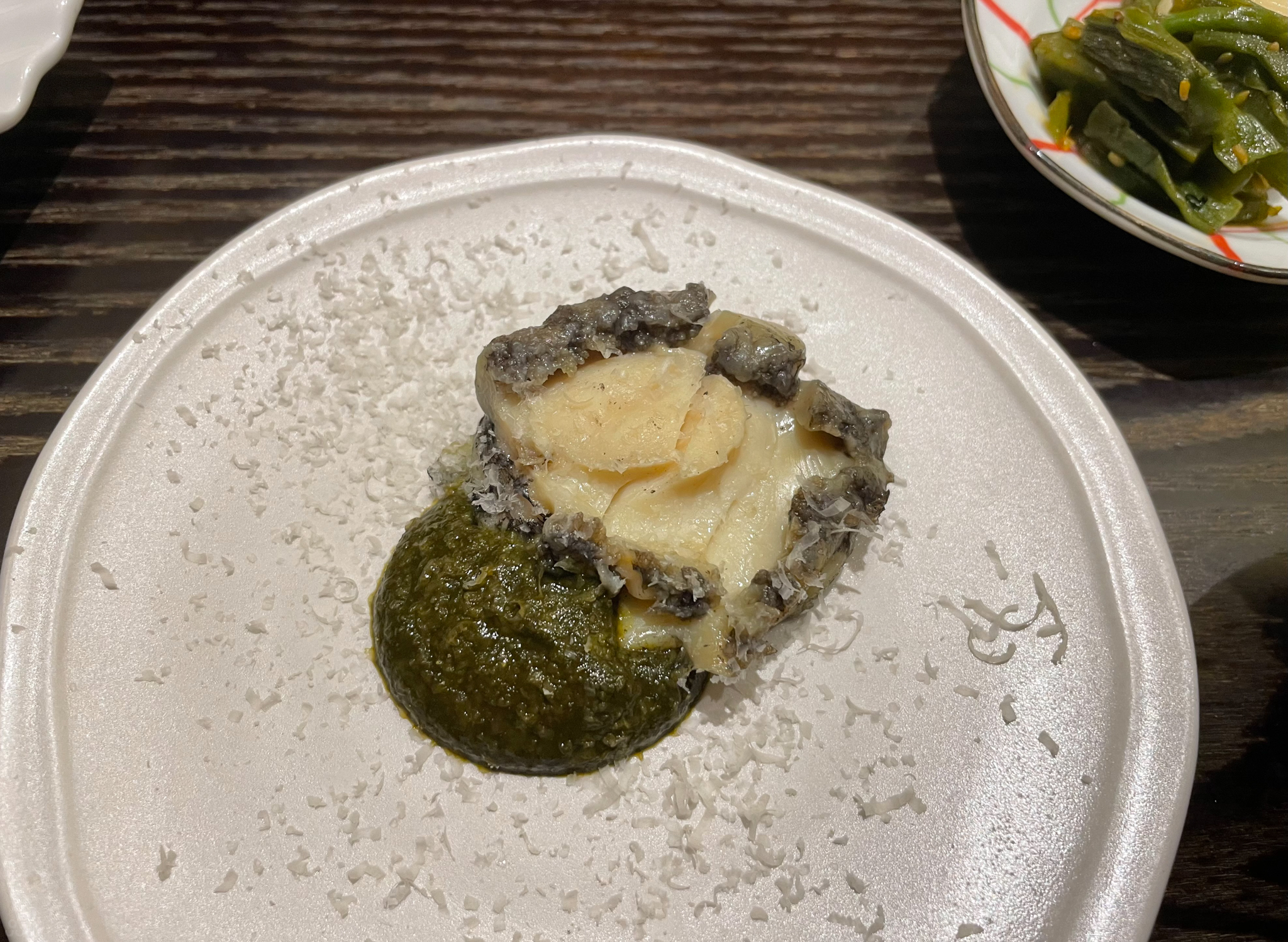 파르미지아노 레지아노를 올린 전복과 내장. 부드럽게 삶아져 있다. 내장 소스는 비린내가 나지 않았다.