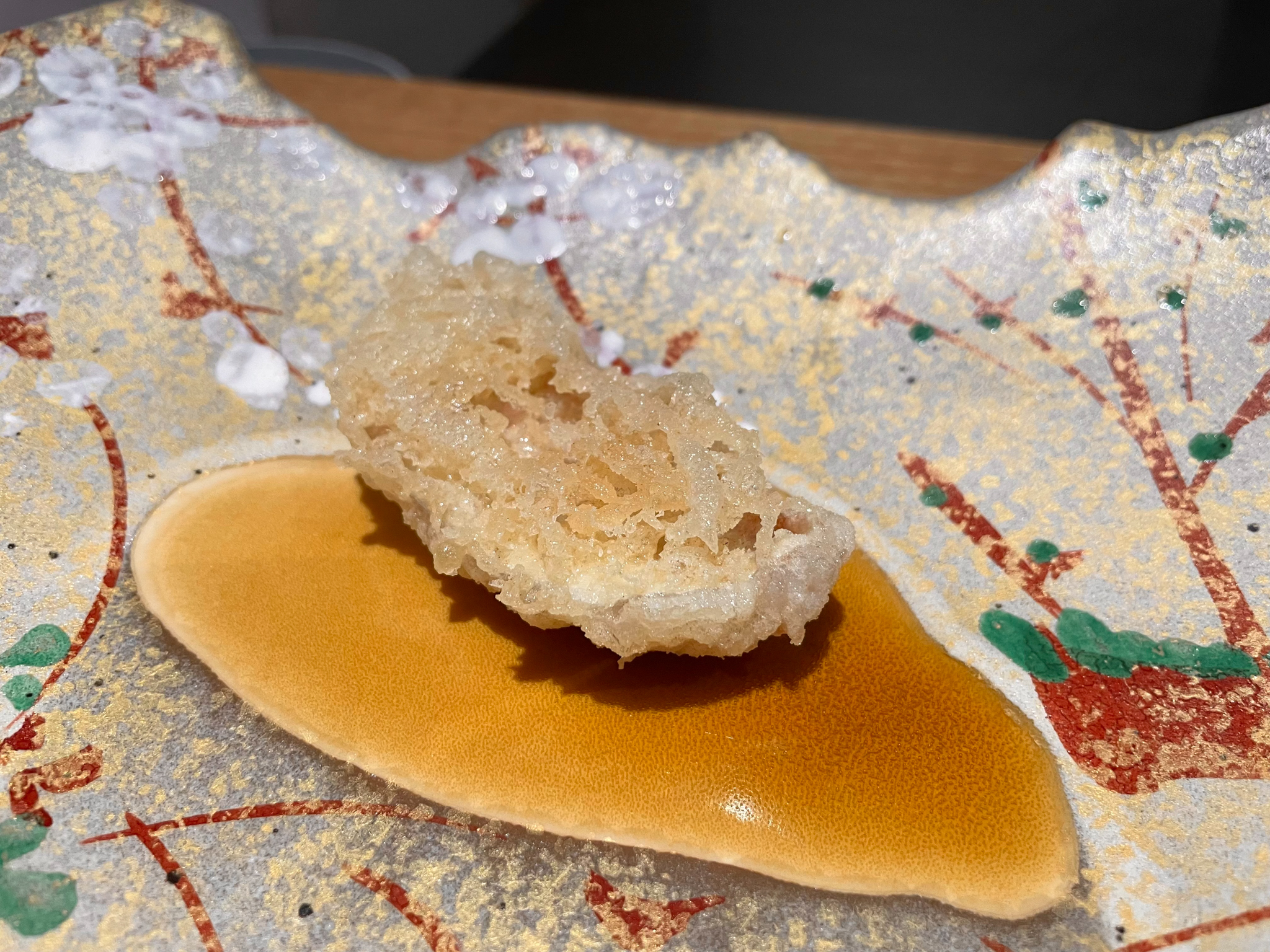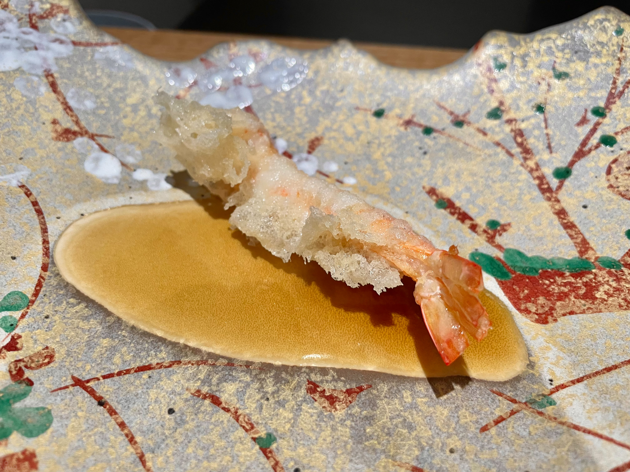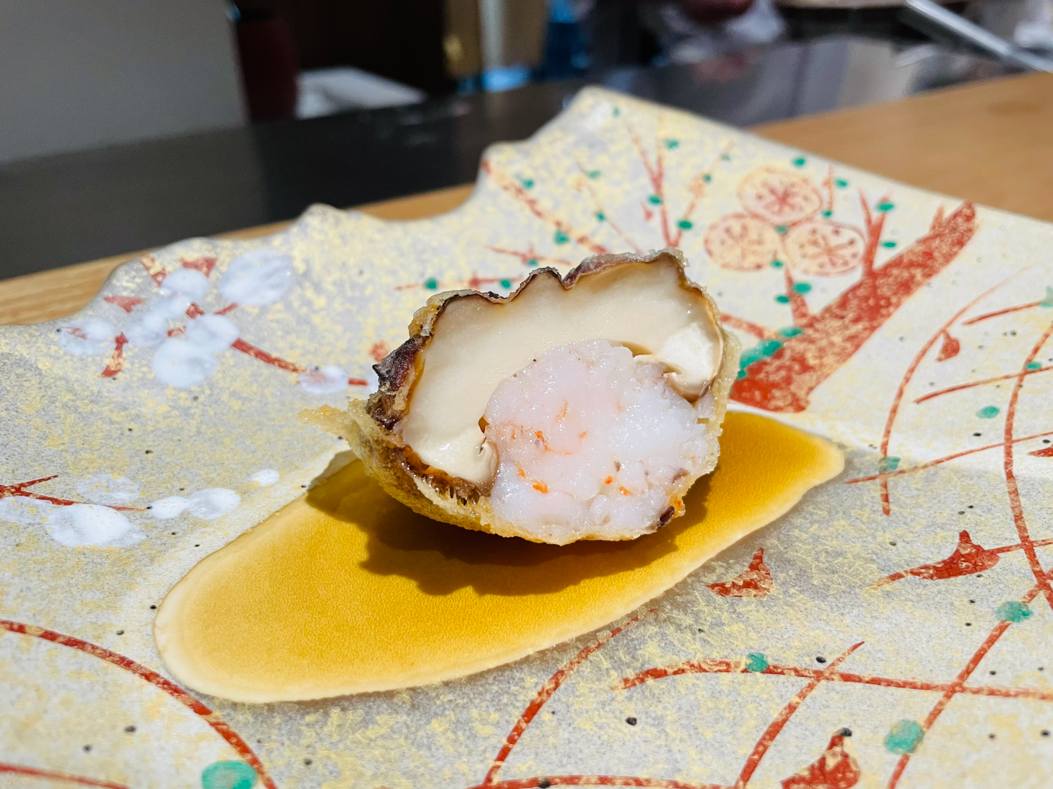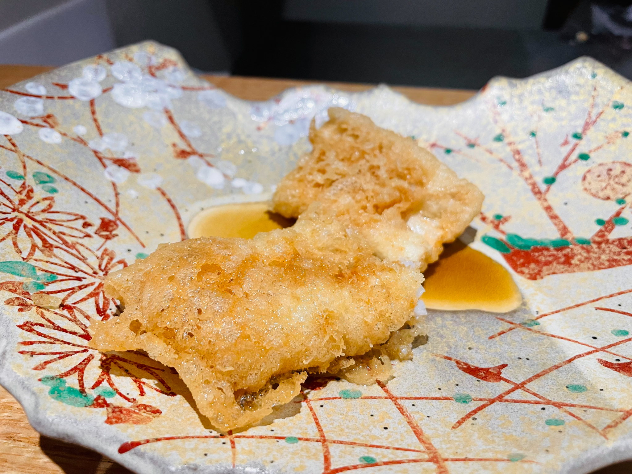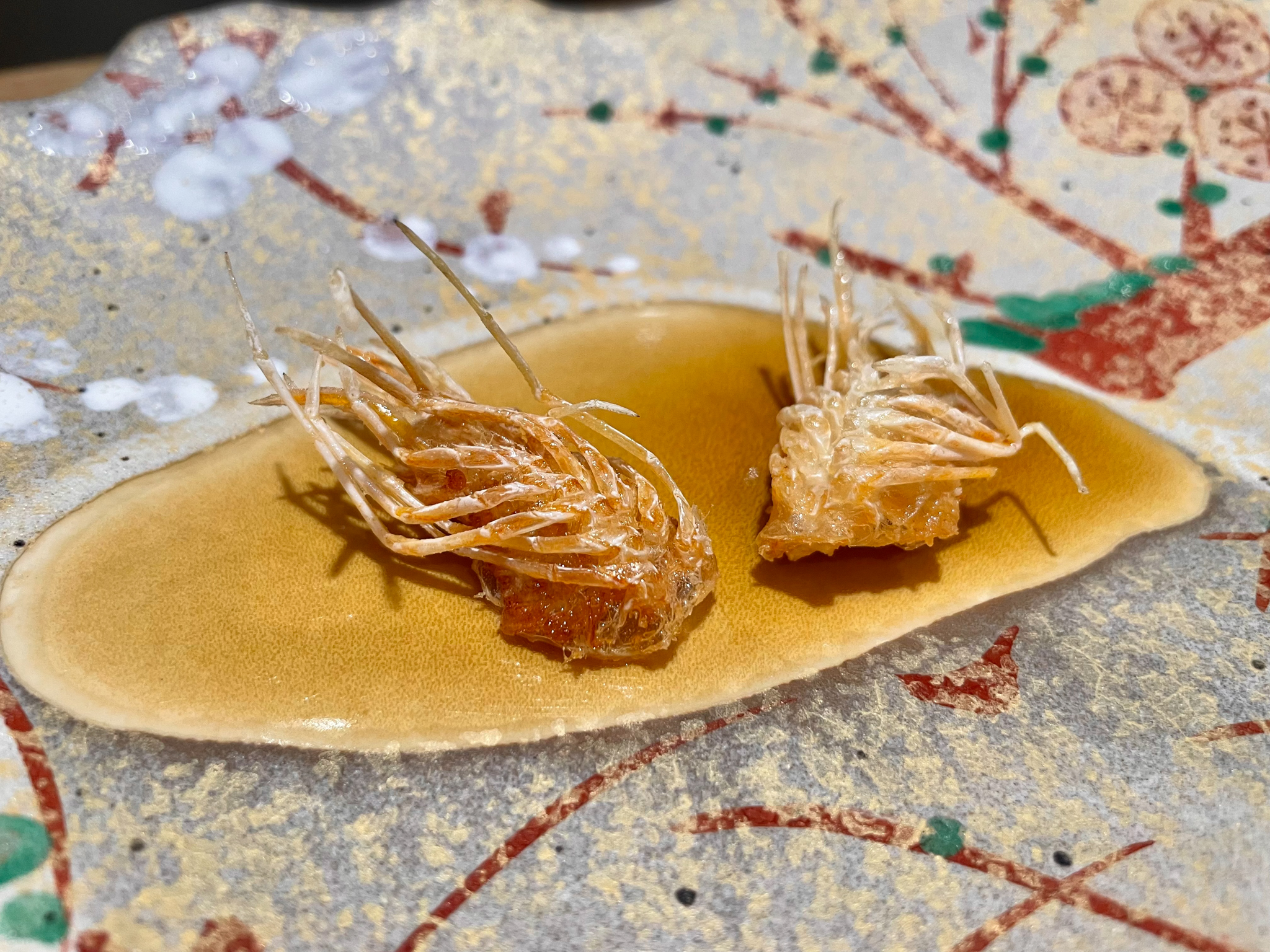 새우 머리 튀김. 쓴 맛이 없으며 껍질이 바삭하며 경쾌하게 씹히고 안에 남아 있는 살의 감촉도 느껴진다. 친구가 새우 머리의 비주얼에 거부감을 느껴 두 개를 더 먹을 수 있었다 흐흐.