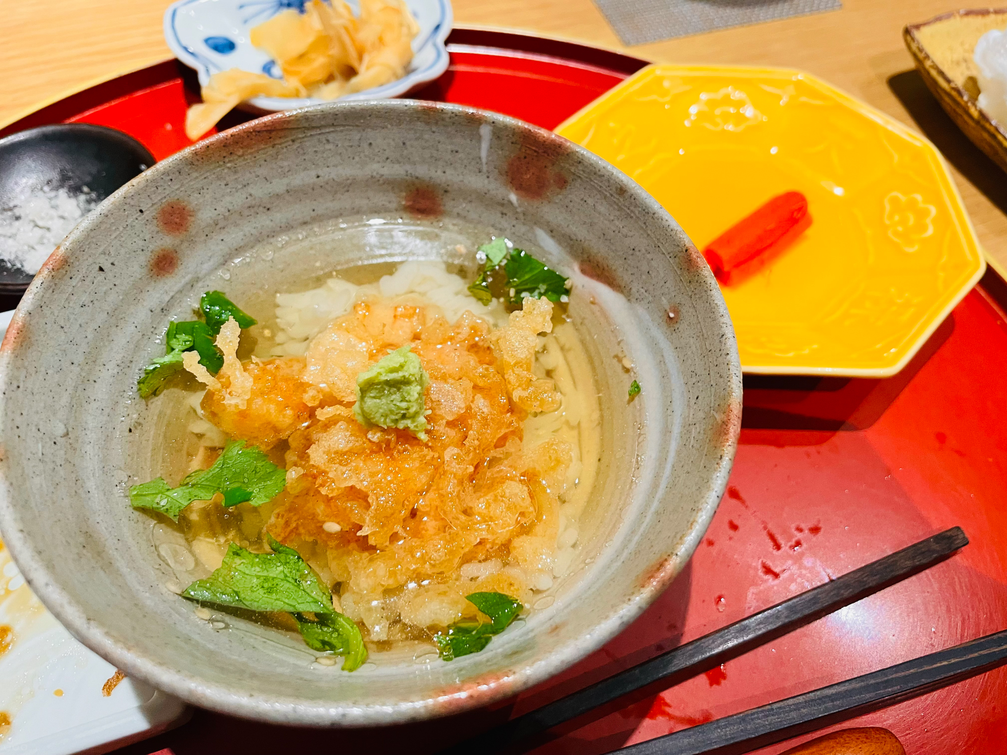 튀김 오차즈케와 산 우엉 절임. 얼마 먹지 않은 것 같은데 배가 나름 찬다. 저 튀김에도 새우와 연근이 들어 있다.