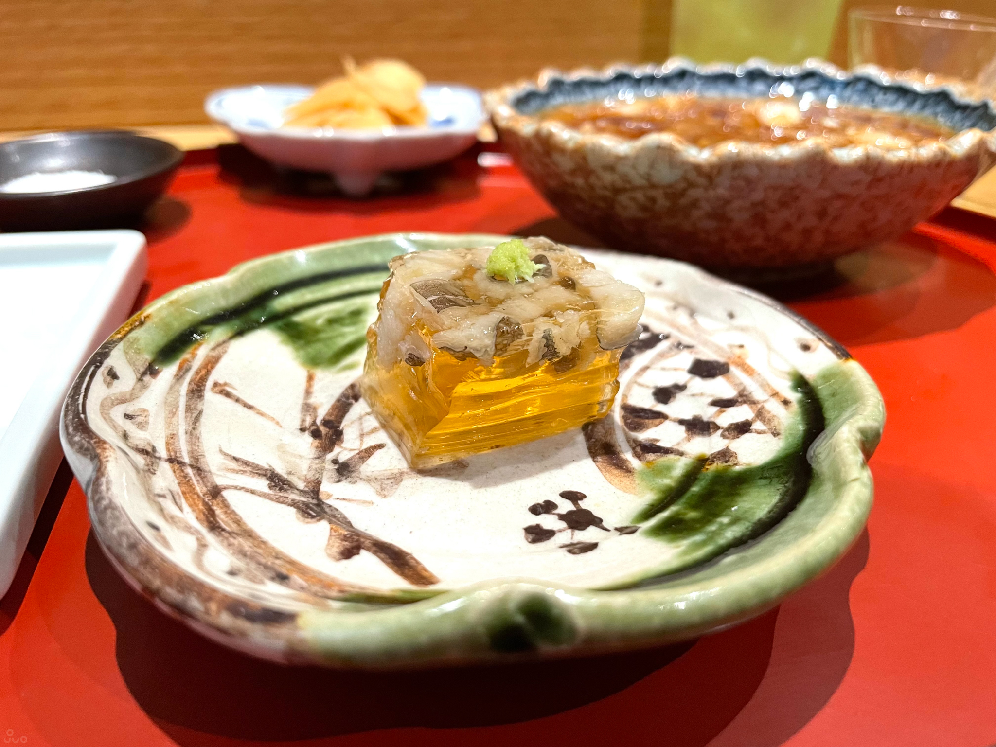 바닷장어 젤리. 젤리에서 짭조름한 감칠맛이 느껴지며 달게 양념된 장어 살이 씹힌다. 재미있는 맛이다.