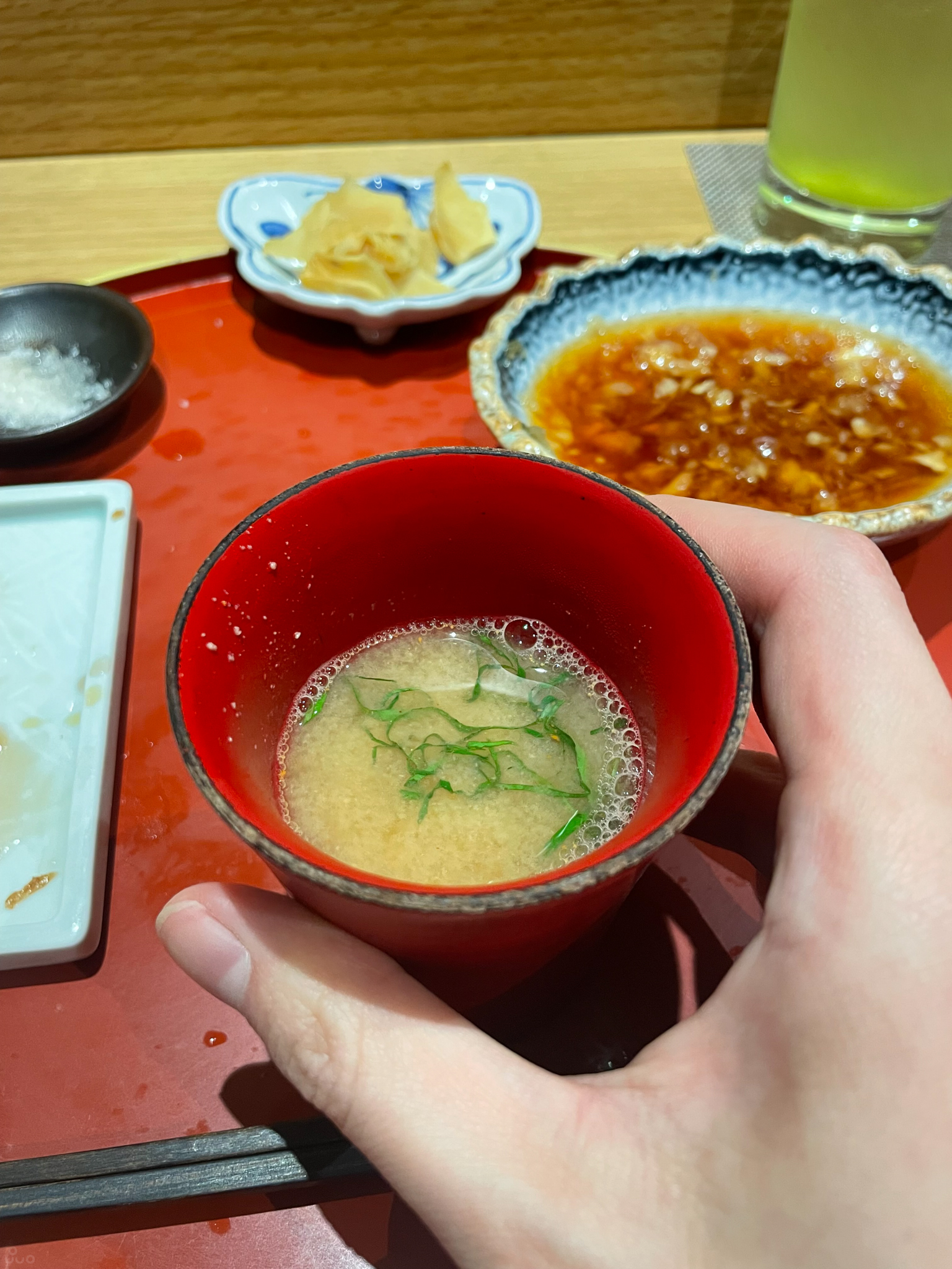 새우로 맛을 낸 된장국. 새우 향이 강하게 느껴져 과장하면 말린 새우를 마시는 느낌이다.