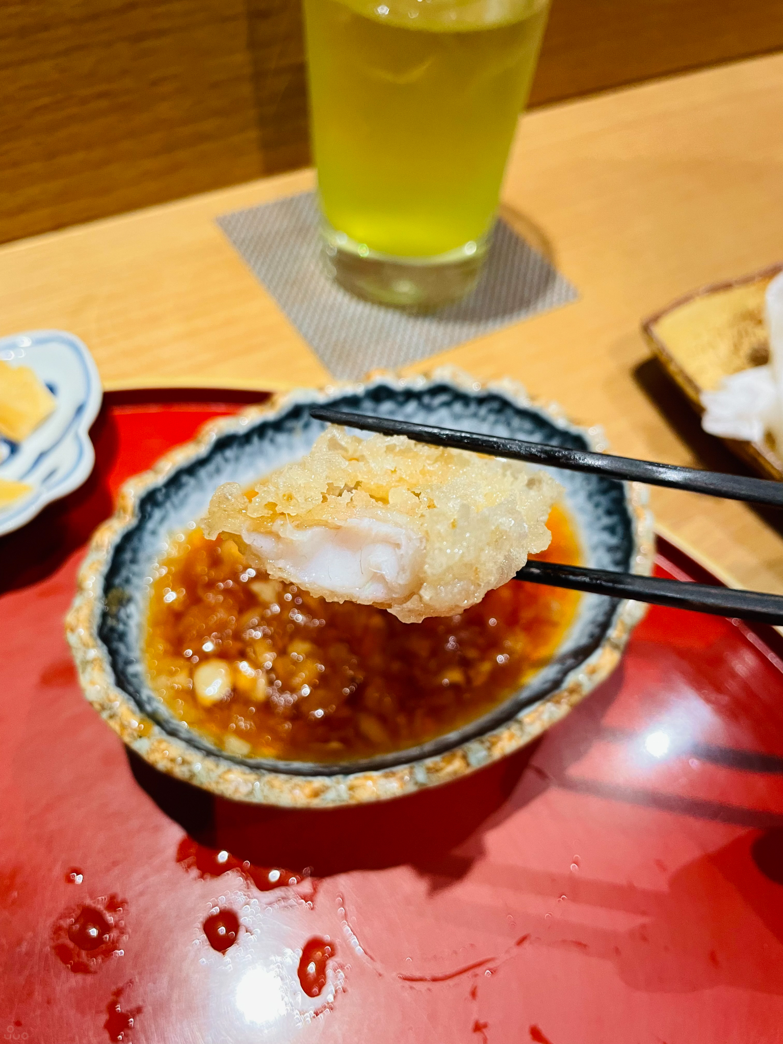 새우. 총 두 마리가 나오며 각각 소금과 쯔유에 찍어 먹는다. 통통하고 탄력 있으며 새우살의 달달한 맛이 좋았다. 역시 갓 튀긴 건 맛있다.