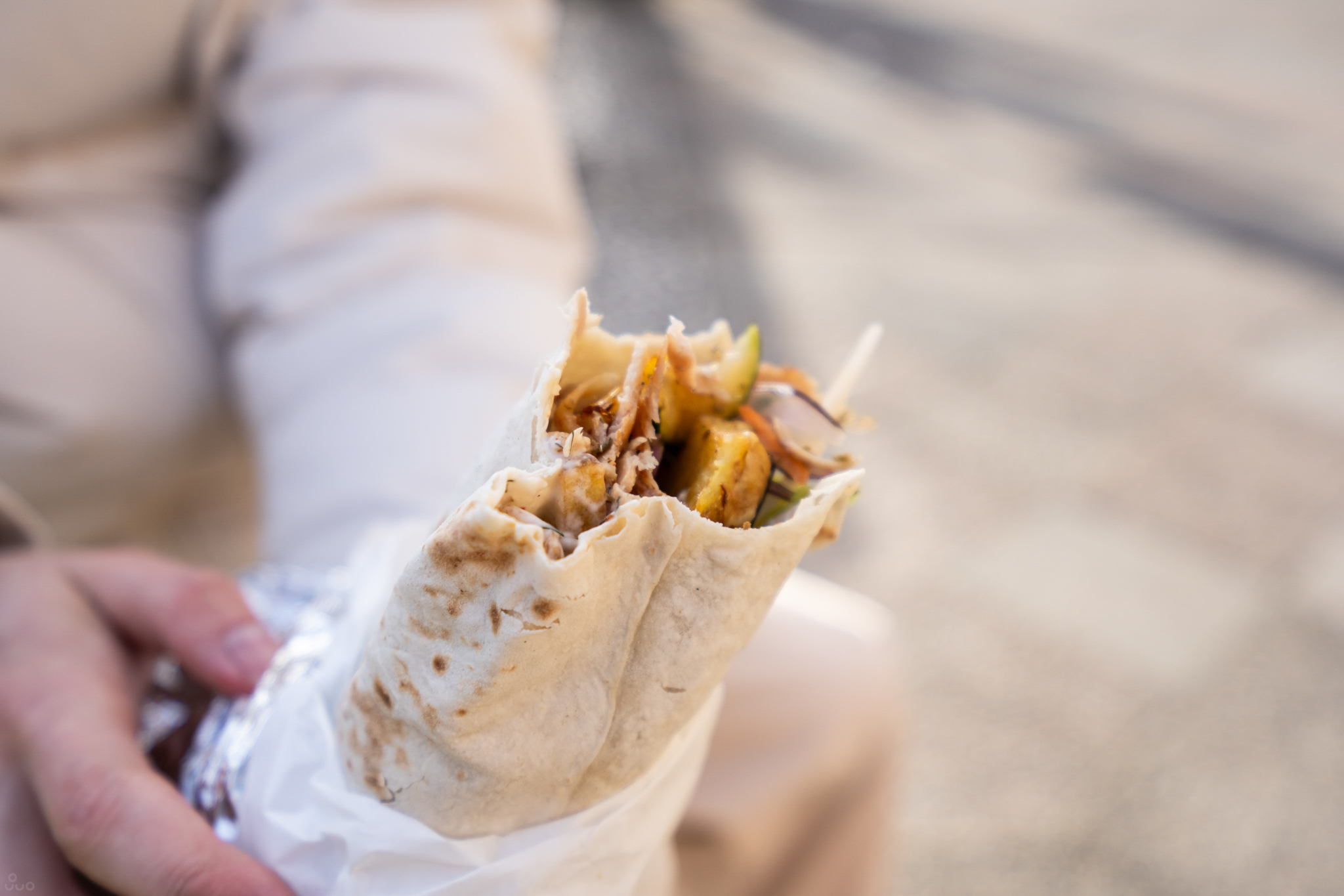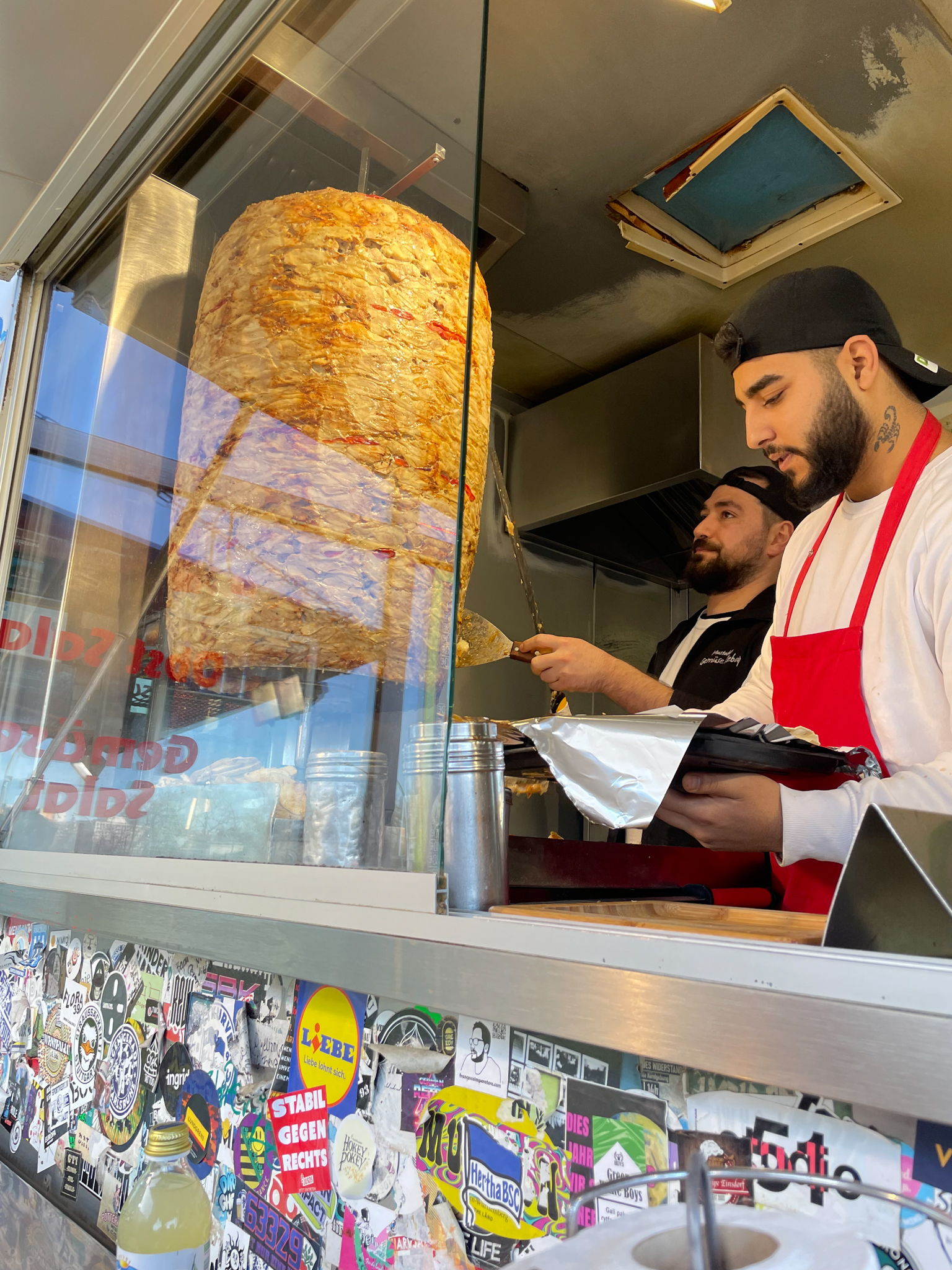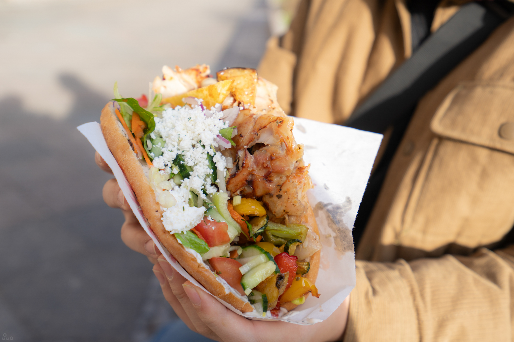 예전부터 가 보고 싶었던 무스타파 야채 케밥을 먹으러 갔다. 일찍 가서 줄이 그렇게 길진 않았으나 그냥 하나하나 만드는 시간이 오래 걸린다. J는 되너, 나는 먹기 편해 보이는 뒤림으로 골랐다. 테이블이 없고 근처에 대충 앉아서 먹어야 했기 때문이다. 속재료는 같다.
