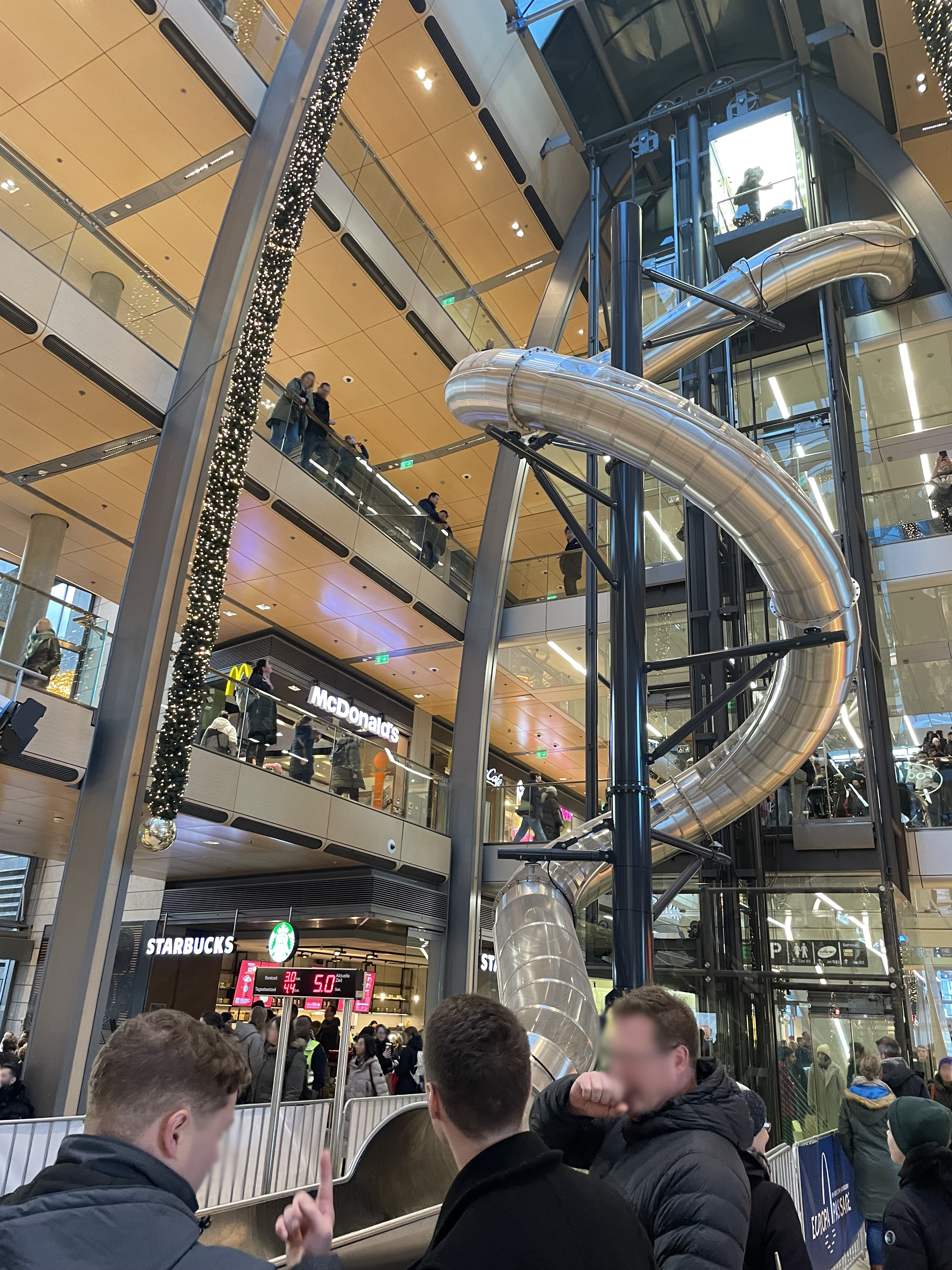 Europa Passage에 들어가 봤는데 한가운데 5층에서부터 내려오는 미끄럼틀이 있었다. 무료로 탈 수 있어 우리도 줄을 서서 타 봤다. 높고 빠르고 재밌지만 급회전 구간에서 무릎을 부딪히고 말았다. 왜 이런 미끄럼틀을 탈 때 몸을 일 자로 펴라고 하는지 이제야 알았다.