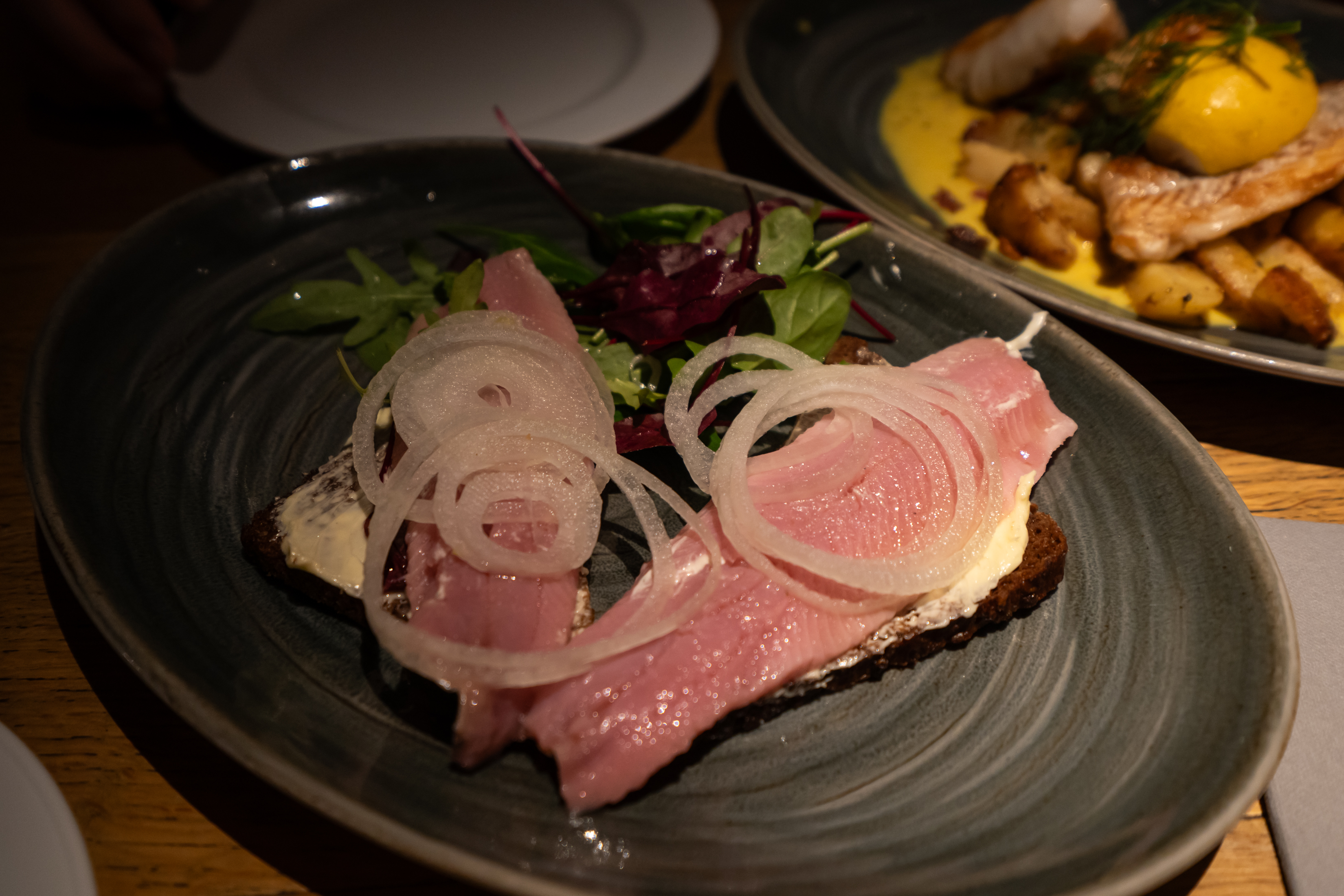 식당 내부 장식은 무슨 박물관에서 뜯어온 것 같이 고풍스러웠으며 간만에 친절하고 빠릿빠릿한 서버를 만났다. 맥주 맛은 말할 필요도 없고, 생선구이도 괜찮았다. 독일에선 전통적으로 흑빵에 올린 청어를 많이 먹는다 해서 주문해 봤는데 안주로 괜찮은 핑거푸드였다. 오이 샐러드와 같이 먹으니 어울렸다.