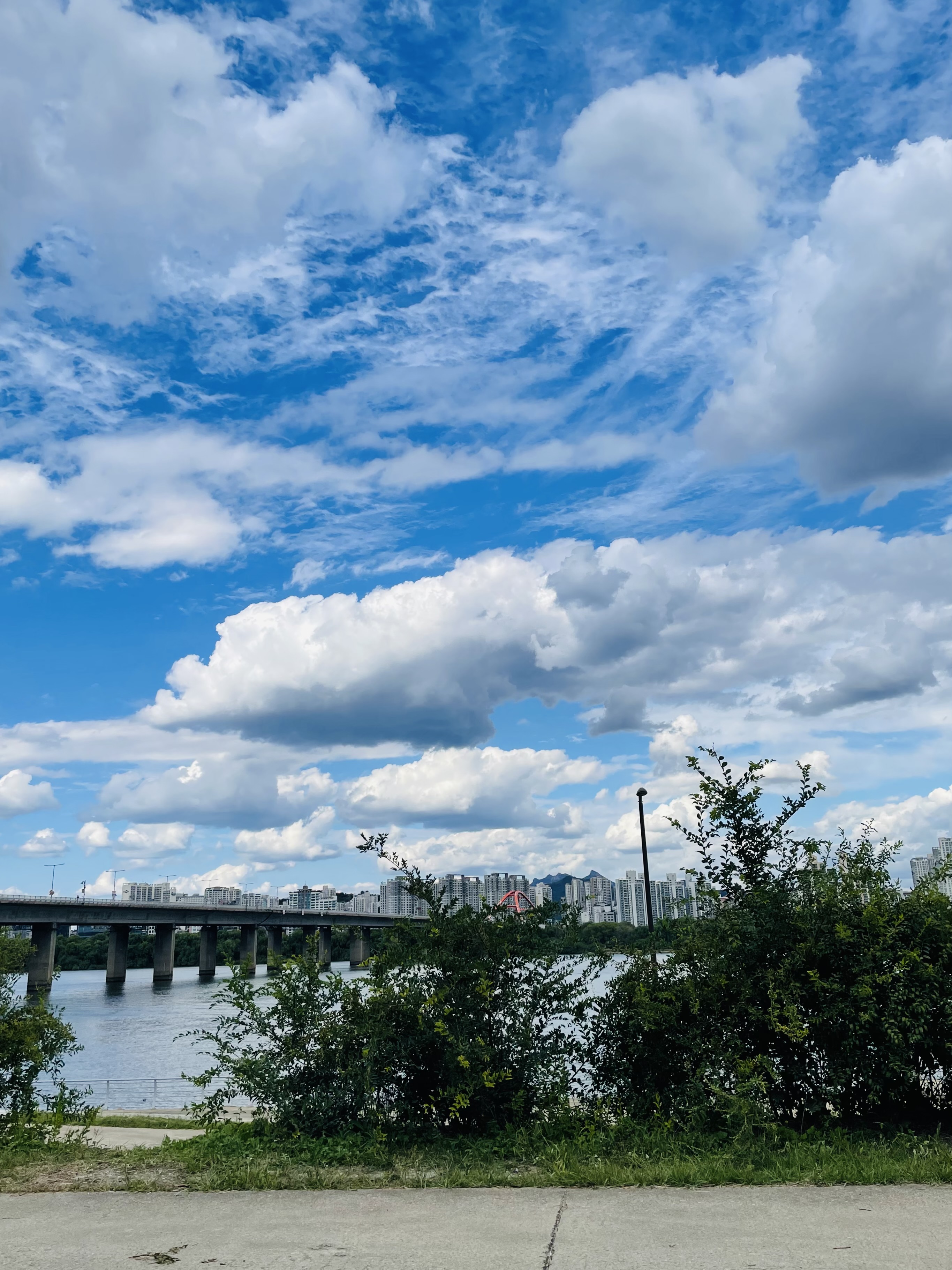 우리는 포기하고 한강에 가서 돗자리를 깔고 쉬었다. 파란 하늘에 구름이 몽실몽실 떠 있어 무척이나 예뻤다.
