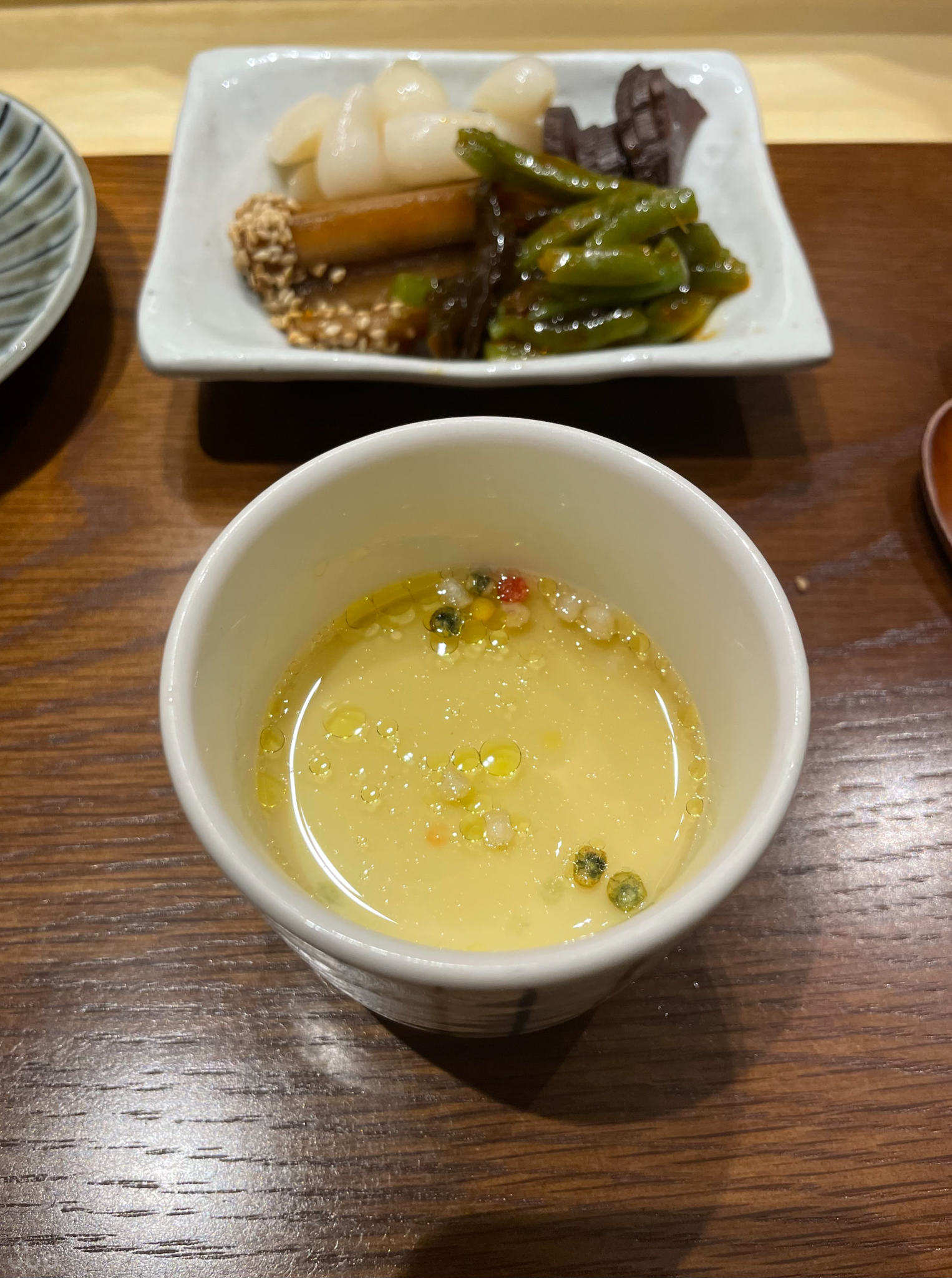 역시 처음으론 차완무시로 속을 달래줘야 한다. 국물에 트러플 오일이 살짝 올라가 있다. 조개, 버섯, 새우가 들어있으며 탄력 있게 씹혔다.