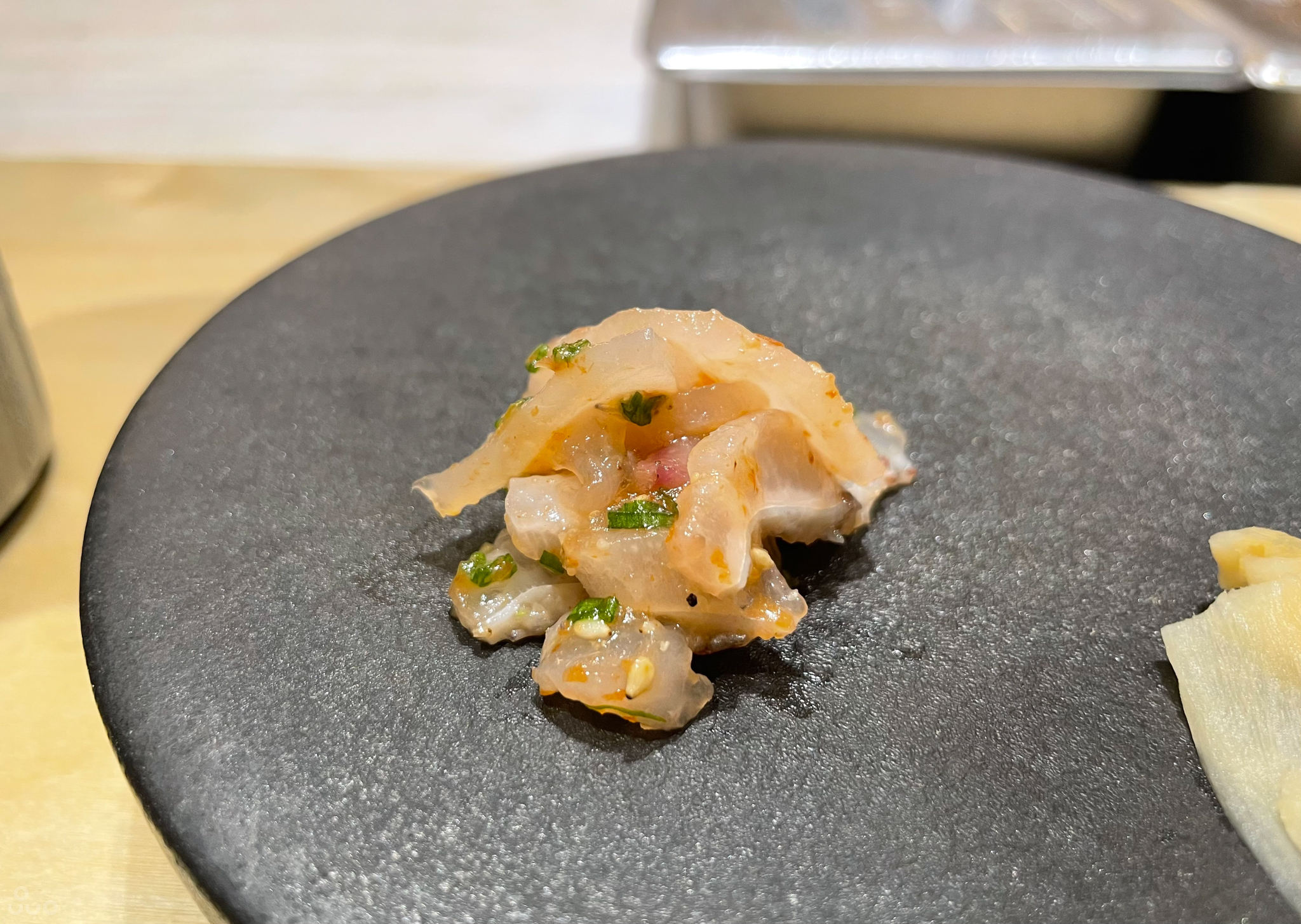 시그니쳐. 달달하고 크리미한 소스를 광어로 감쌌고, 겉은 새콤한 간장 젤리 같은 것으로 보인다. 내 입맛엔 소스가 좀 달았고 광어 대신 더 부드러운 참치, 그중 너무 기름지지 않은 등살 정도를 썼으면 좋지 않았을까. 하지만 특이해서 기억에 남았다.