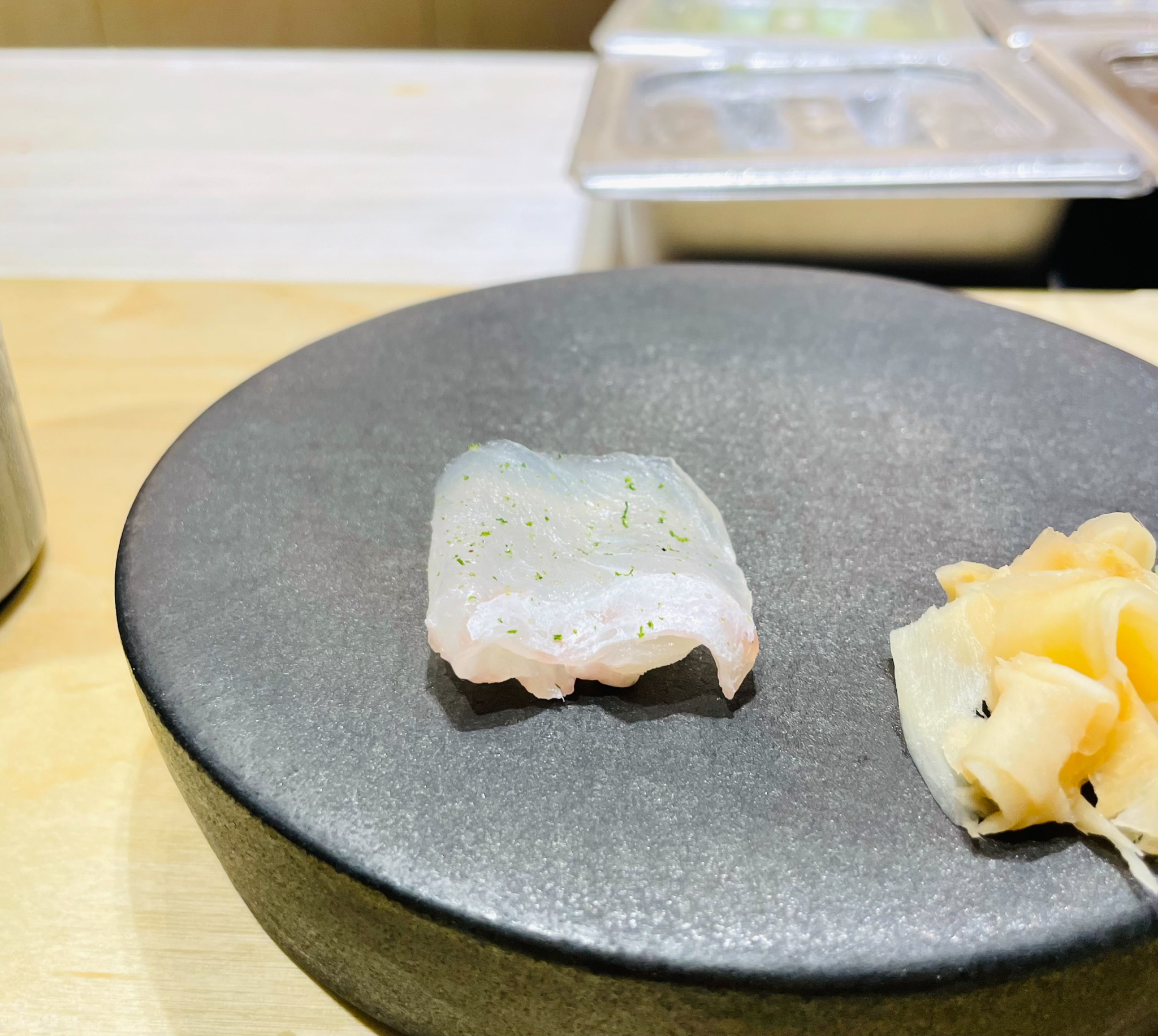청유자 제스트, 히말라야 소금을 뿌린 광어. 유자가 향긋했고 숙성 정도는 딱 좋아 탄력 있고 고소했다.