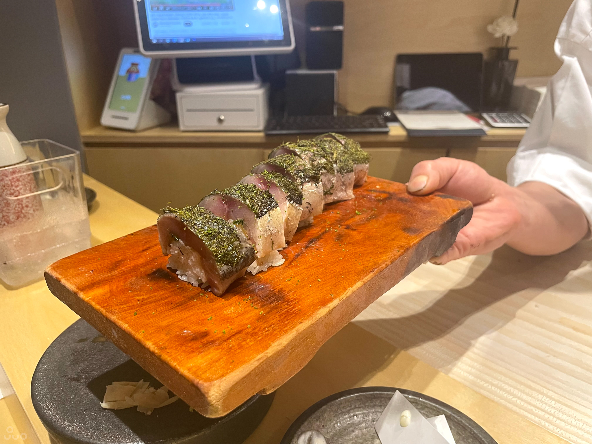 고등어 시메사바 봉초밥. 포토 타임이라 하셔서. 위에 해조류가 올라가 있고 비린내가 하나도 없이 좋았다.