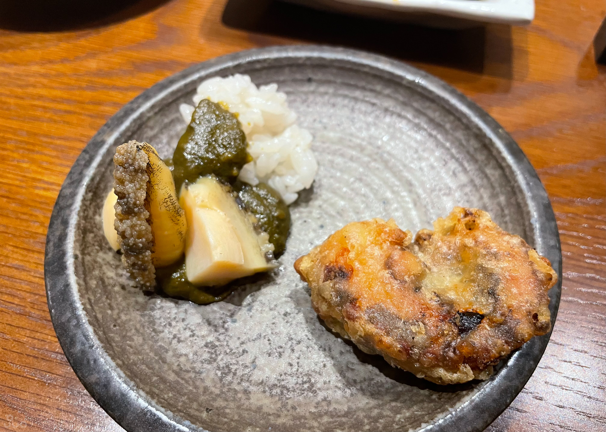 전복찜과 내장 소스, 밥. 전복 익힌 정도는 딱 좋았다. 내장 소스는 전혀 비리지 않았고 여쭤보니 버터가 들어갔다고 한다. 새콤한 밥과 같이 먹으면 좀 괜찮긴 했지만 소스가 너무 달다는 생각은 들었다. 그런데 밥은 정말 잘 지으신 듯.